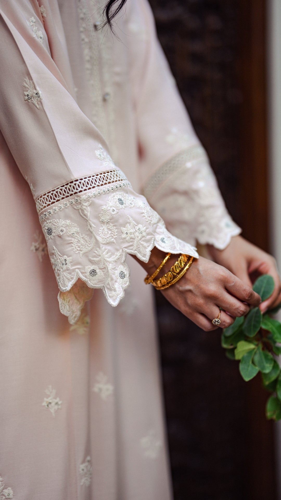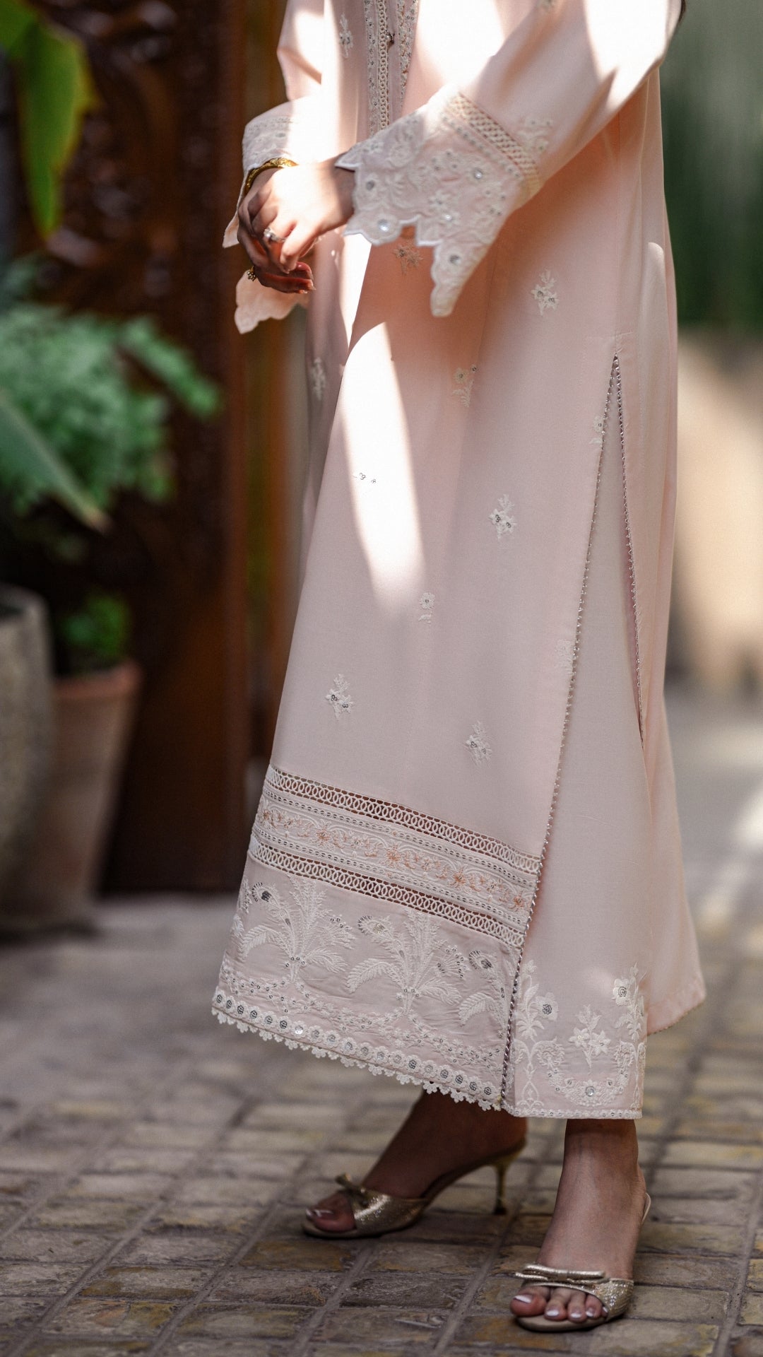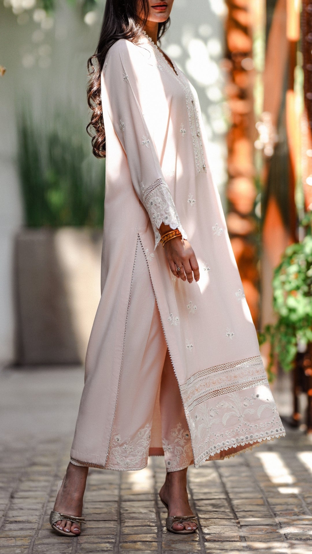 Rendered in a soft blush tone, this timeless silhouette is delicately adorned with ivory embroidery scattered across the canvas. The neckline is finished with intricate lace detailing and subtle embellishments, while the sleeves feature scalloped lace cuffs that add a gentle, feminine finish. An ornate embroidered border along the hem brings depth and texture to the design, creating an effortless piece made for serene Ramadan days and graceful iftar evenings.