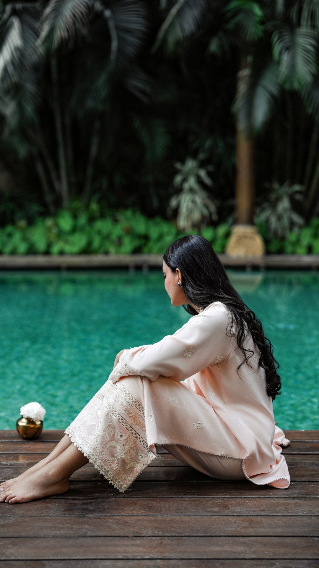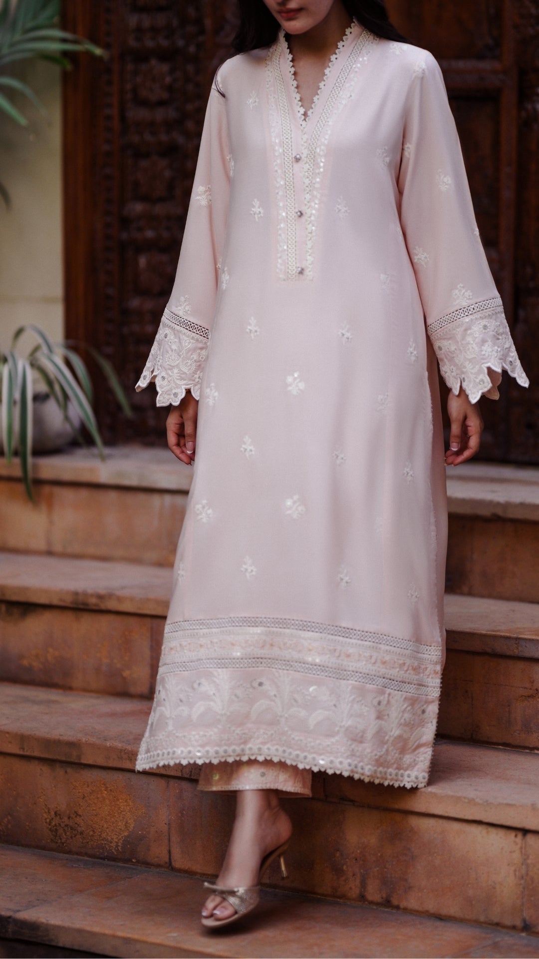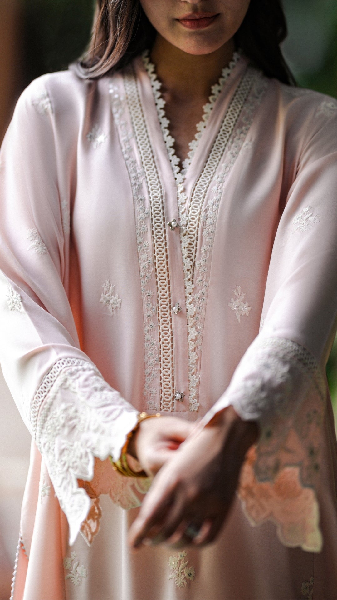 Rendered in a soft blush tone, this timeless silhouette is delicately adorned with ivory embroidery scattered across the canvas. The neckline is finished with intricate lace detailing and subtle embellishments, while the sleeves feature scalloped lace cuffs that add a gentle, feminine finish. An ornate embroidered border along the hem brings depth and texture to the design, creating an effortless piece made for serene Ramadan days and graceful iftar evenings.