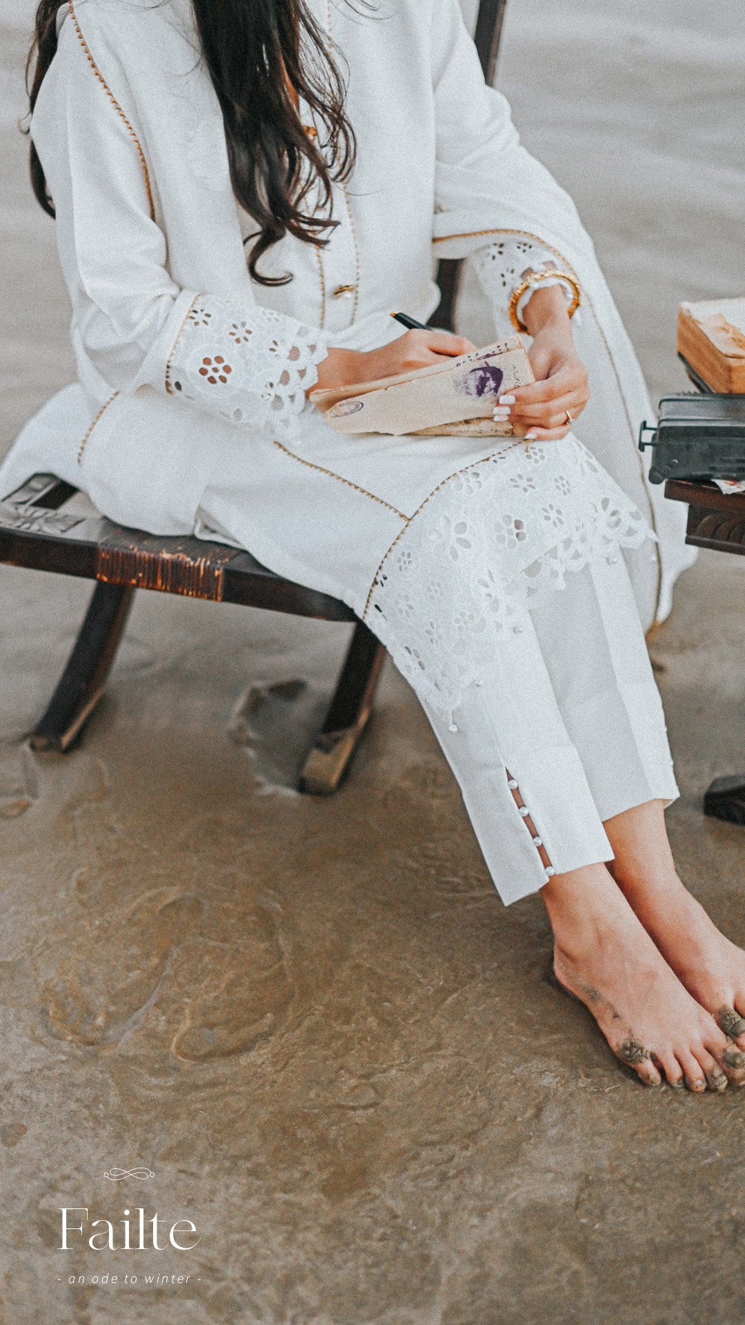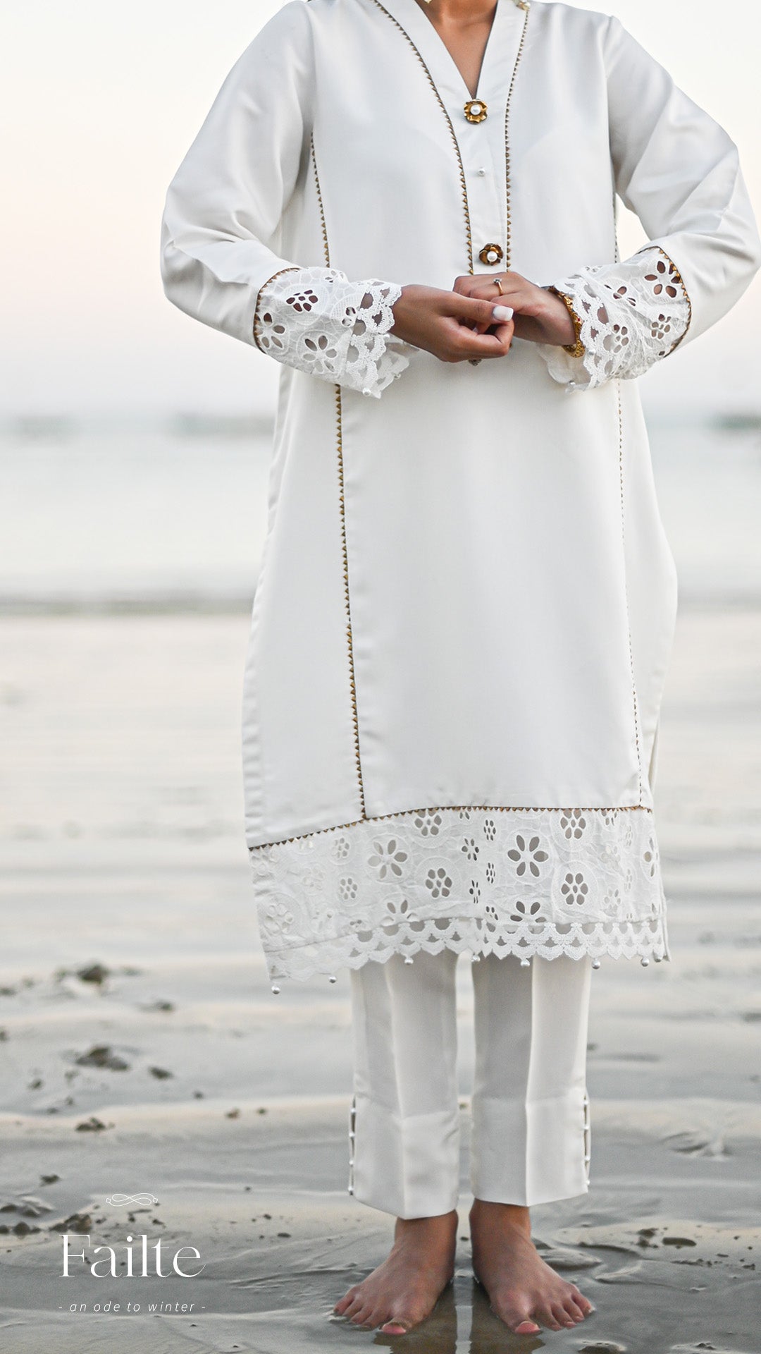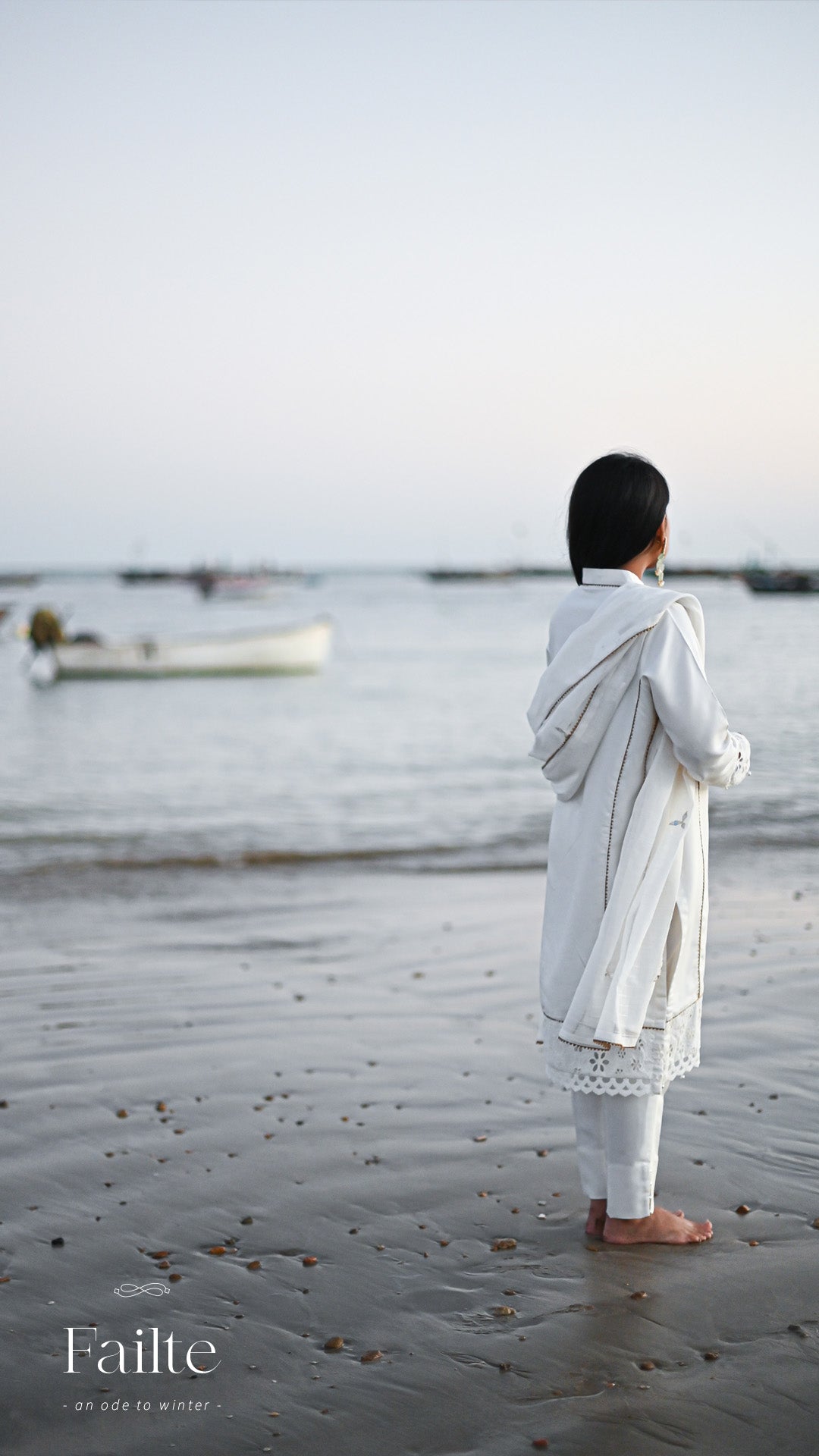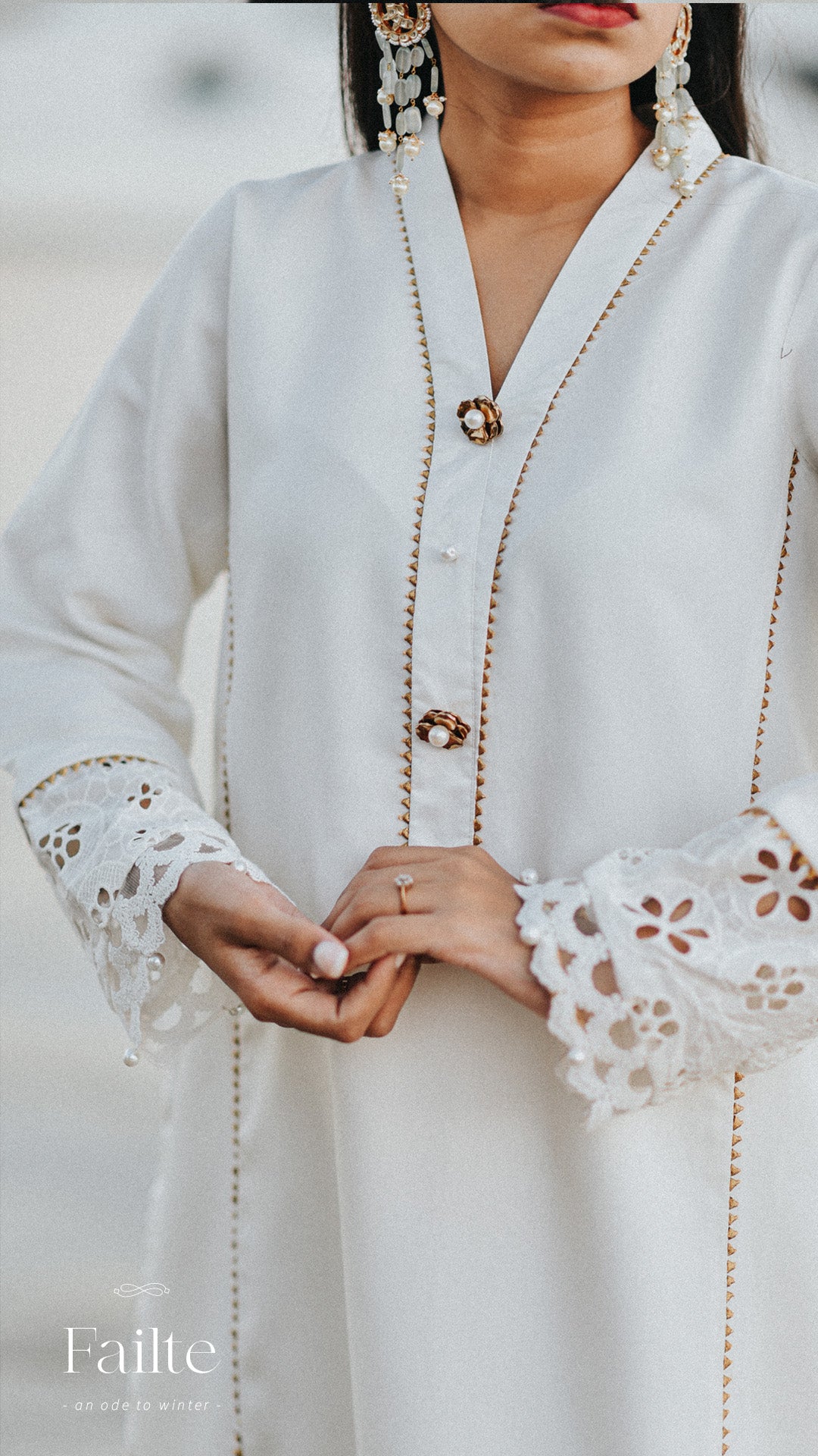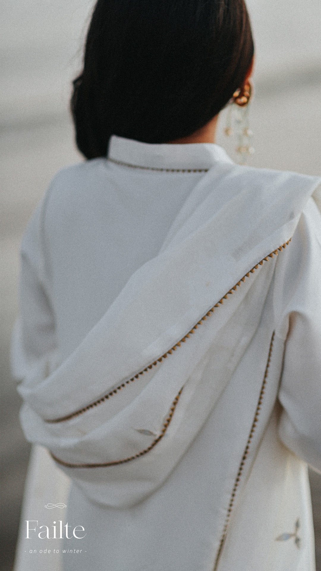 An essential staple for your wardrobe, our classic white marina Kurta is adorned with old school gota, pearls and our signature gold buttons. Well suited for intimate festive occasions.
