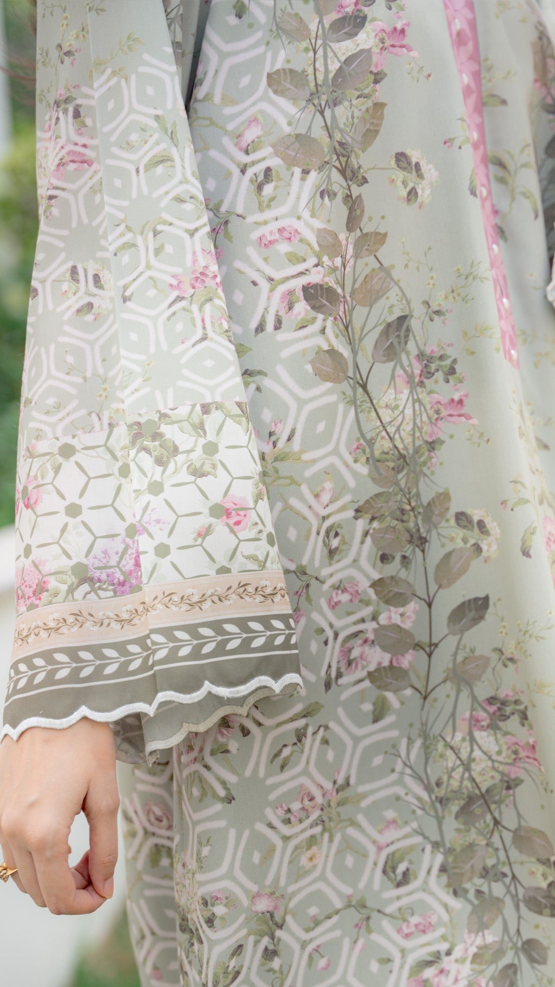 Thoughtfully designed borders in muted olive and rose frame the hem and sleeves, while the airy fabric drapes with ease, offering comfort without compromising on elegance. Perfect for garden brunches, festive lunches, or serene evening gatherings, a timeless piece that feels as beautiful as it looks.