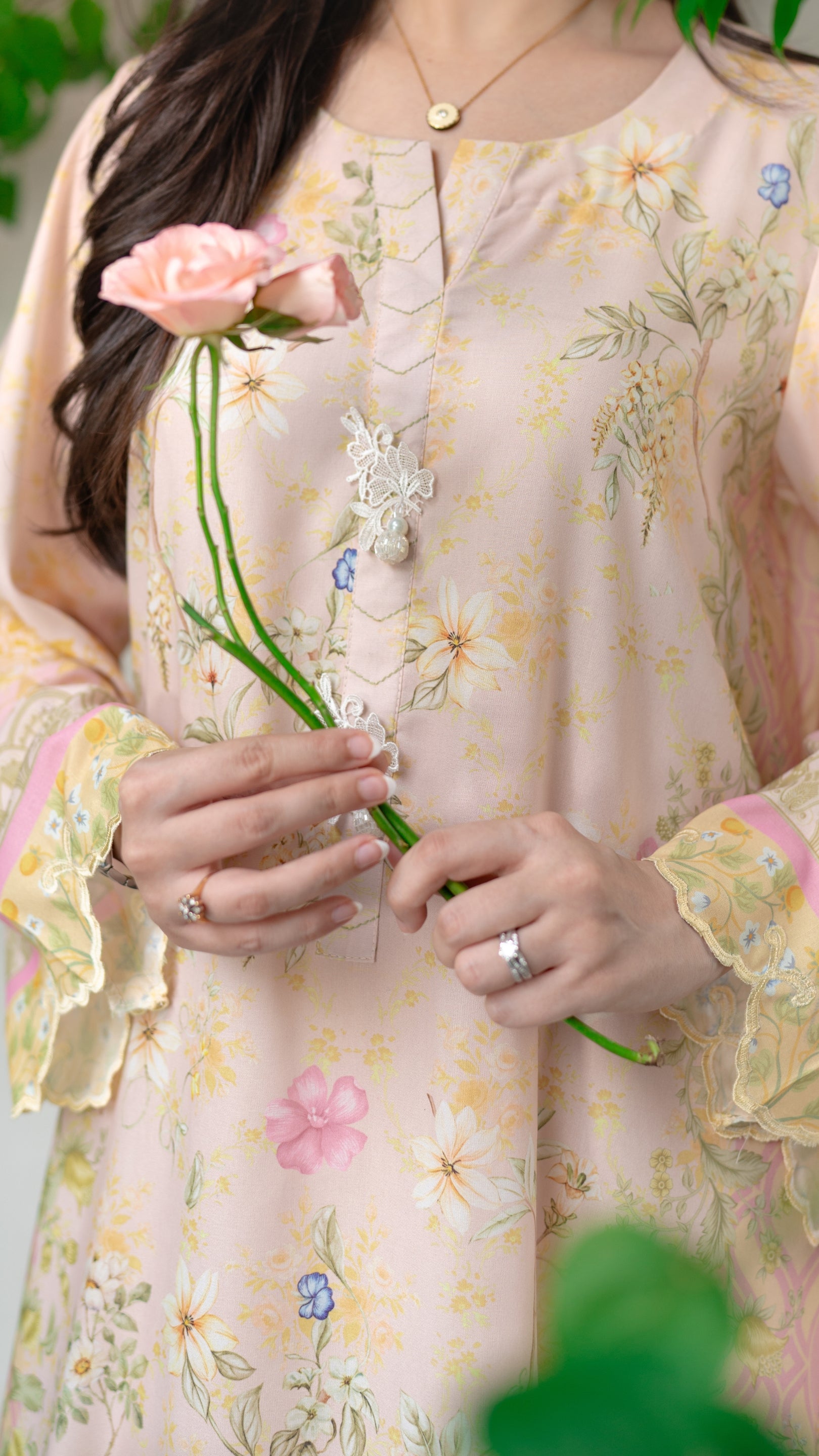 A light yellow kaftan adorned with delicate florals and baroque-inspired motifs in soft pink and sage. The scalloped hem and intricately detailed sleeves lend a feminine charm, while the airy silhouette flows with effortless grace. Paired with matching printed trousers, this ensemble embodies warmth, lightness, and timeless elegance — perfect for serene summer days.