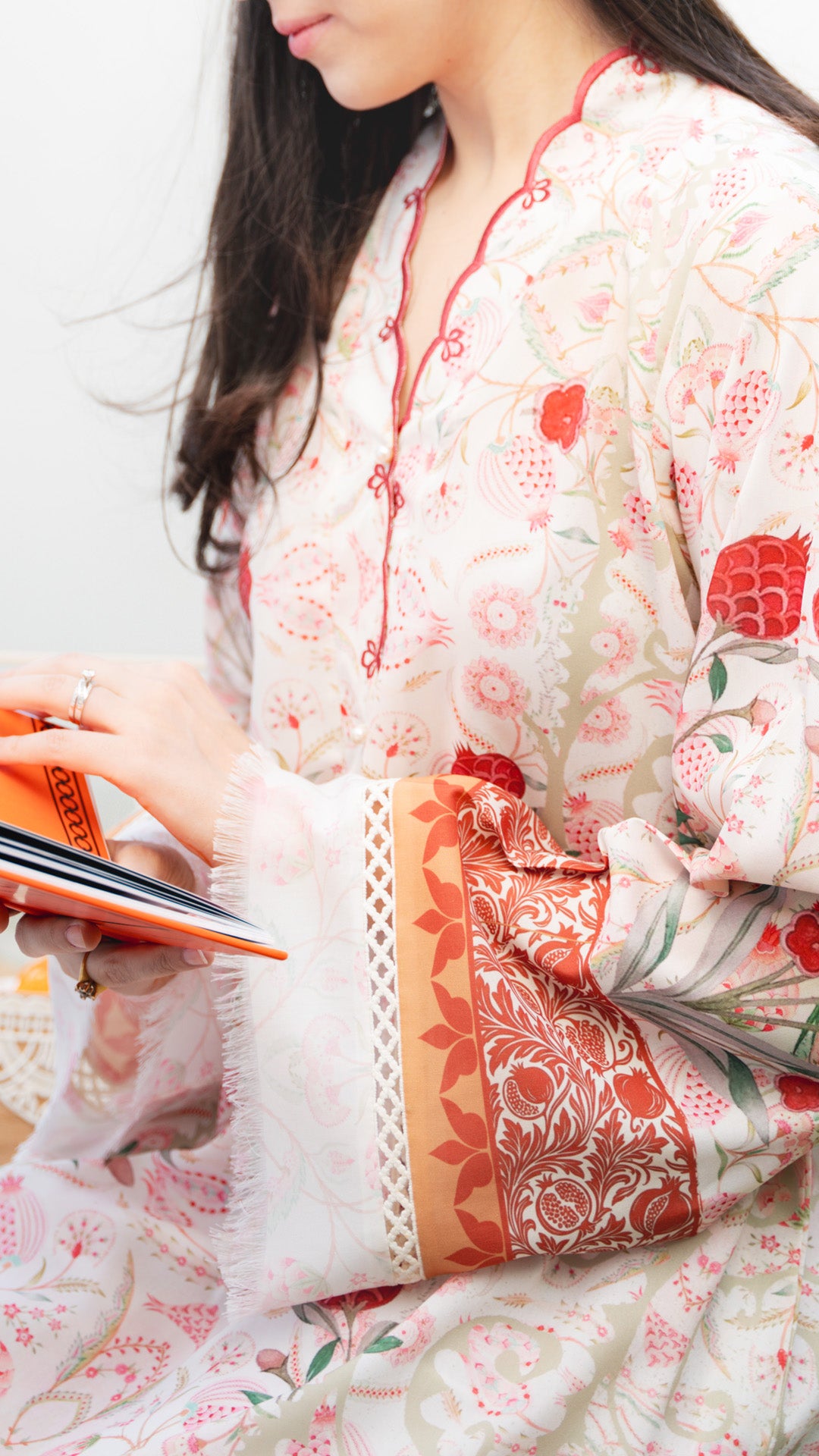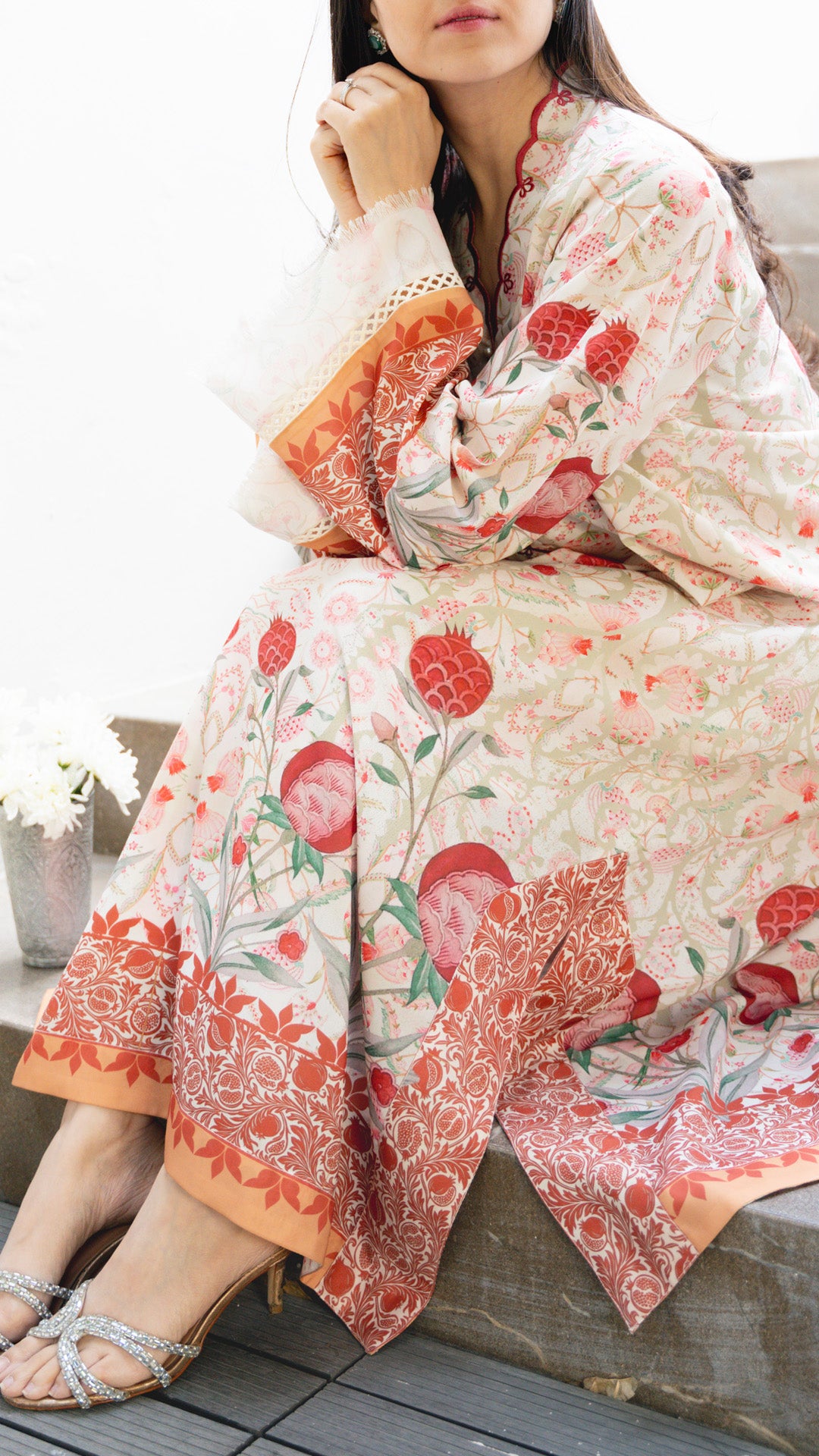 Fresh, feminine, and artfully detailed, this ivory shirt blooms with delicate florals and pomegranate motifs in vibrant shades of coral and red. The flowing silhouette is framed with intricately printed borders in warm orange tones, adding depth and a subtle festive charm.