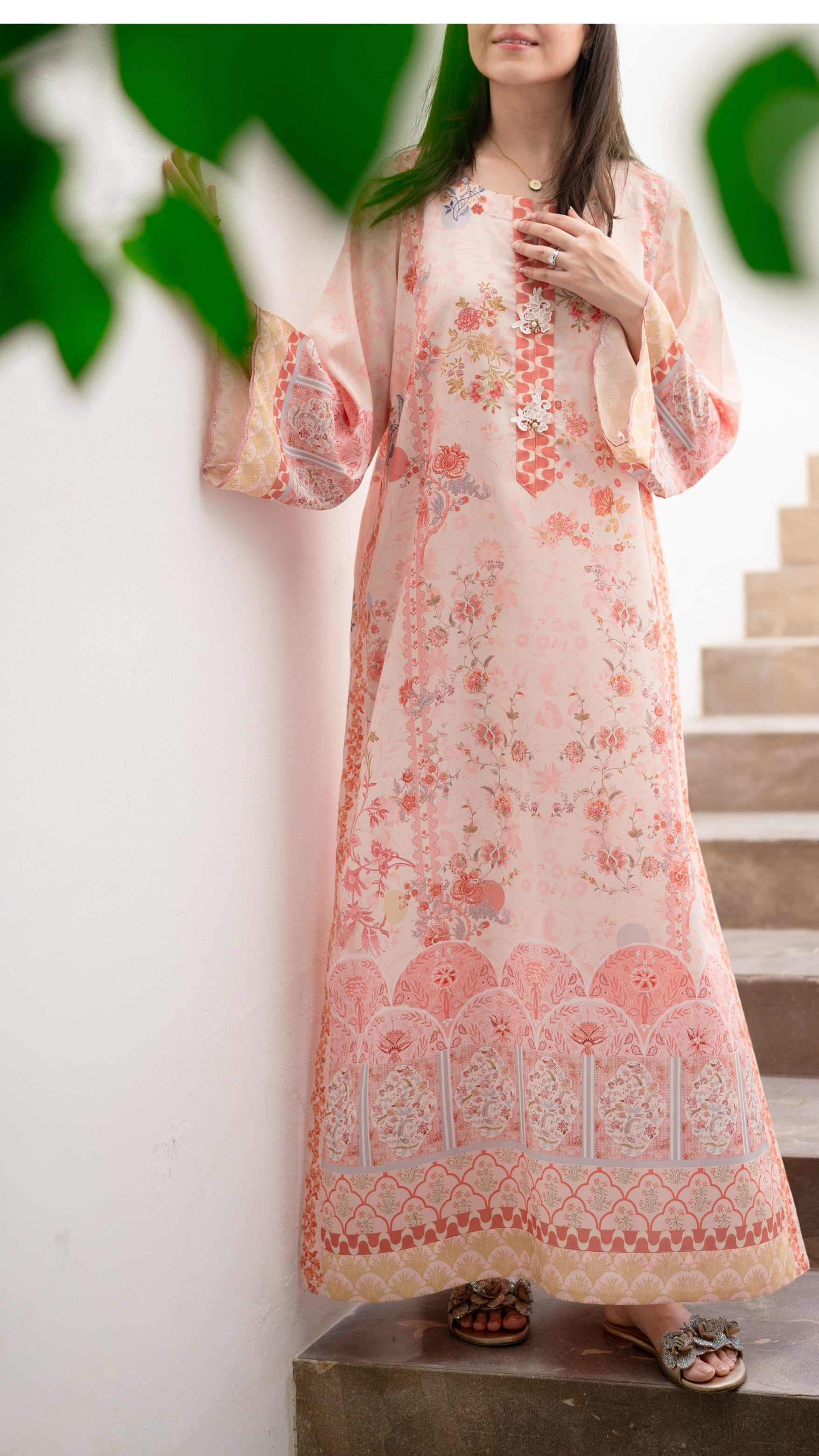 An ethereal blush pink kaftan adorned with intricate floral and architectural motifs in soft coral, peach, and ivory. The design flows gracefully from neckline to hem, featuring delicate detailing on the sleeves and a scalloped border that adds depth and charm. Crafted in a breezy silhouette, it’s perfect for days that call for understated elegance and effortless femininity.