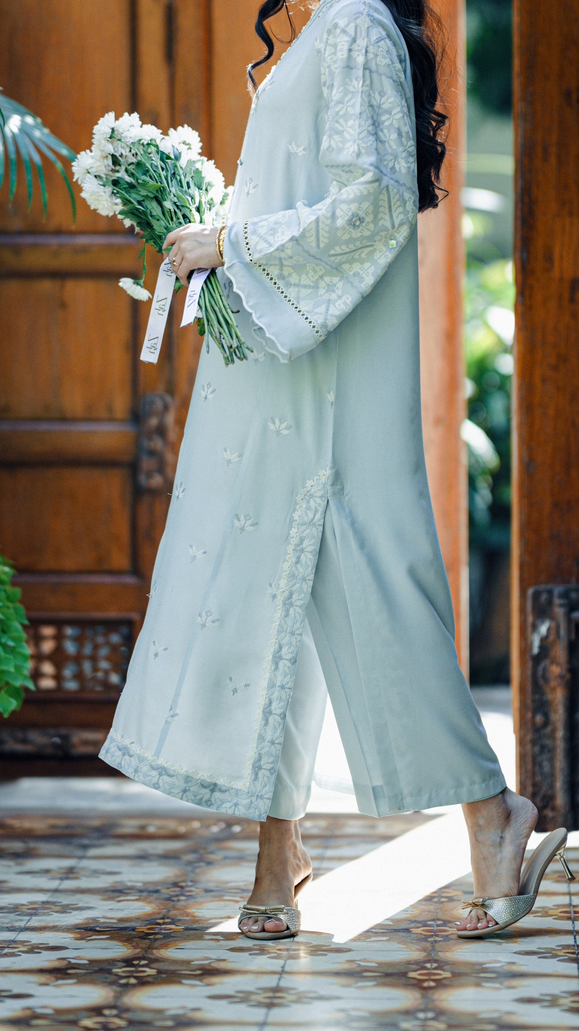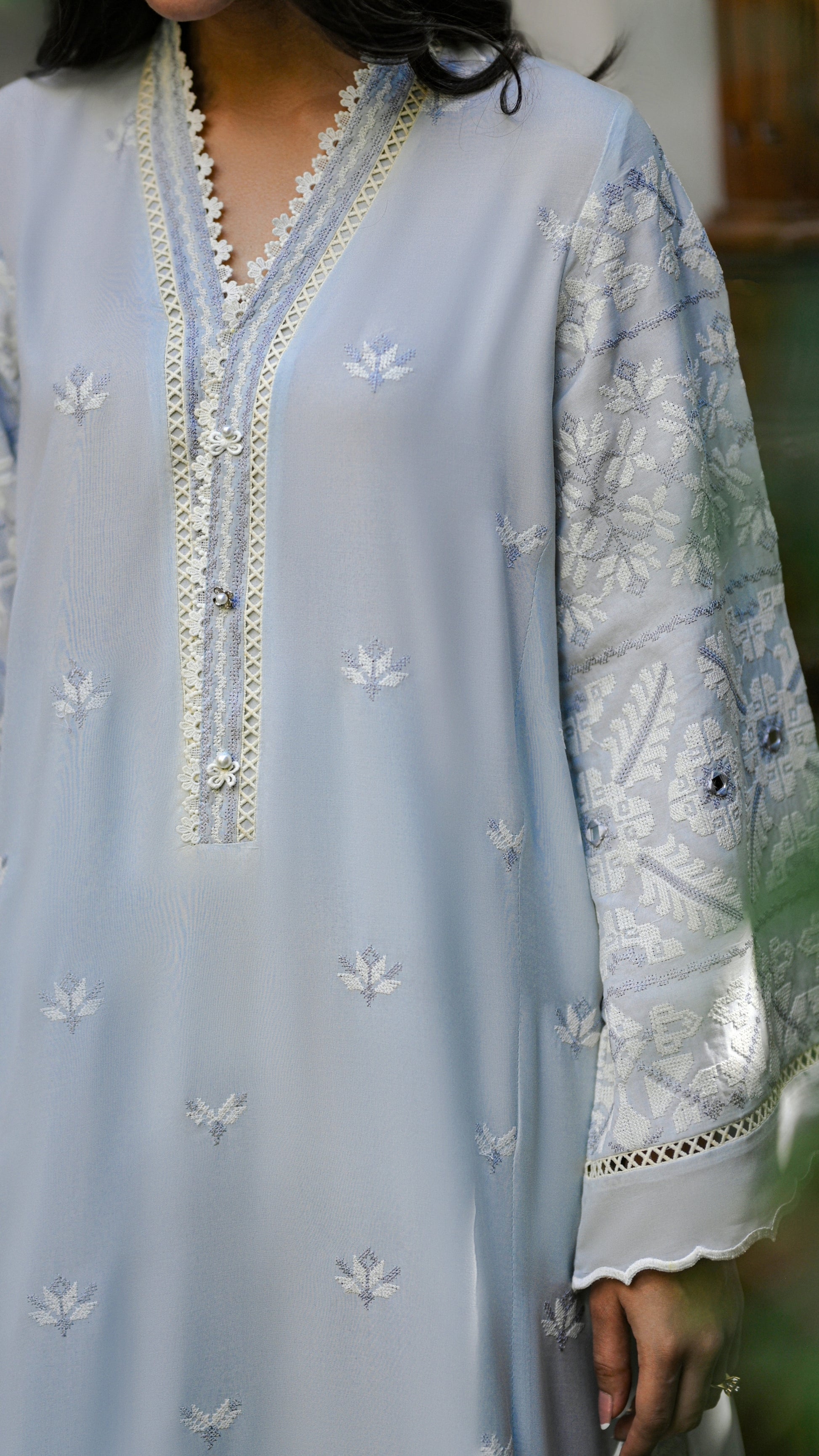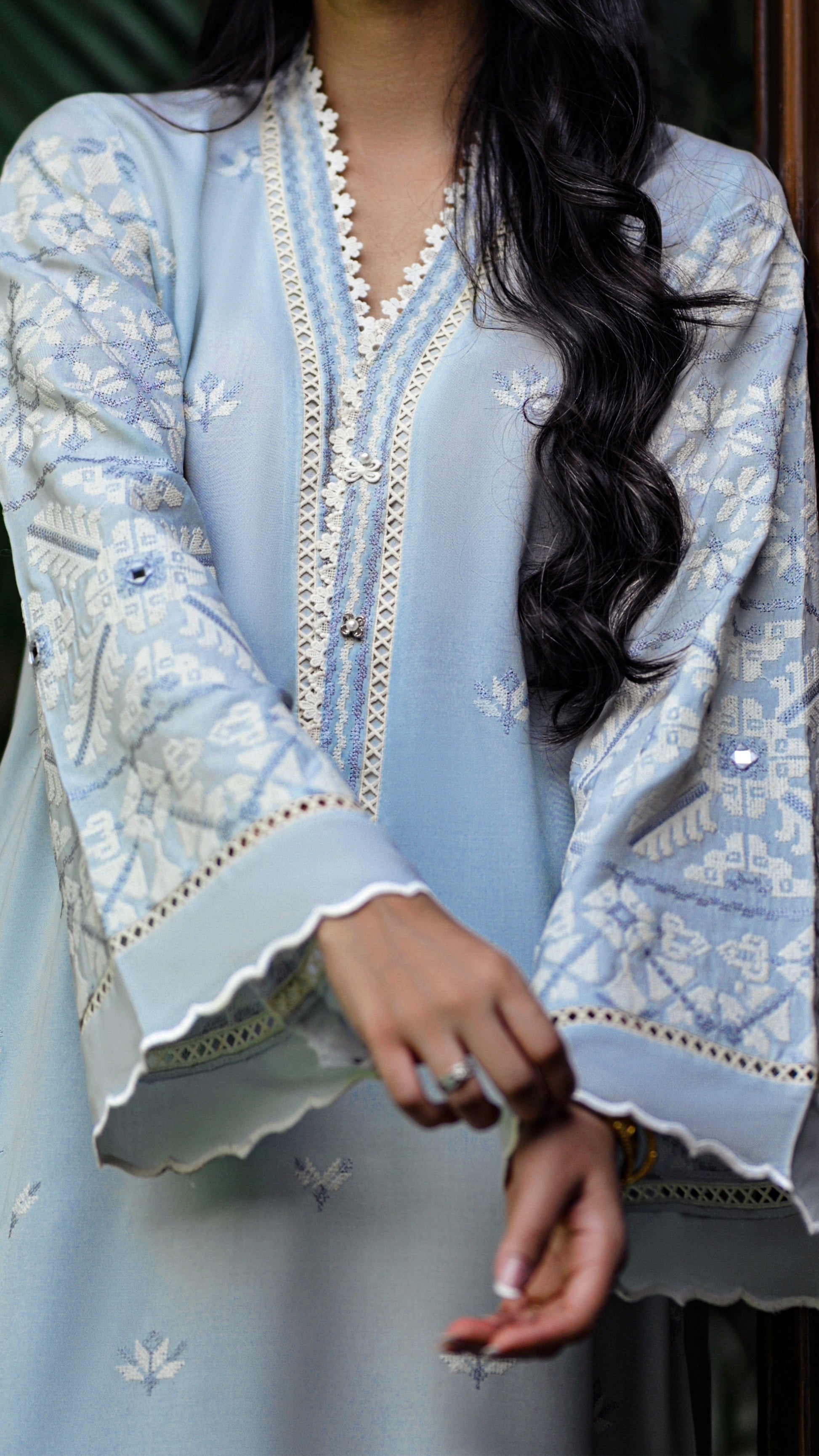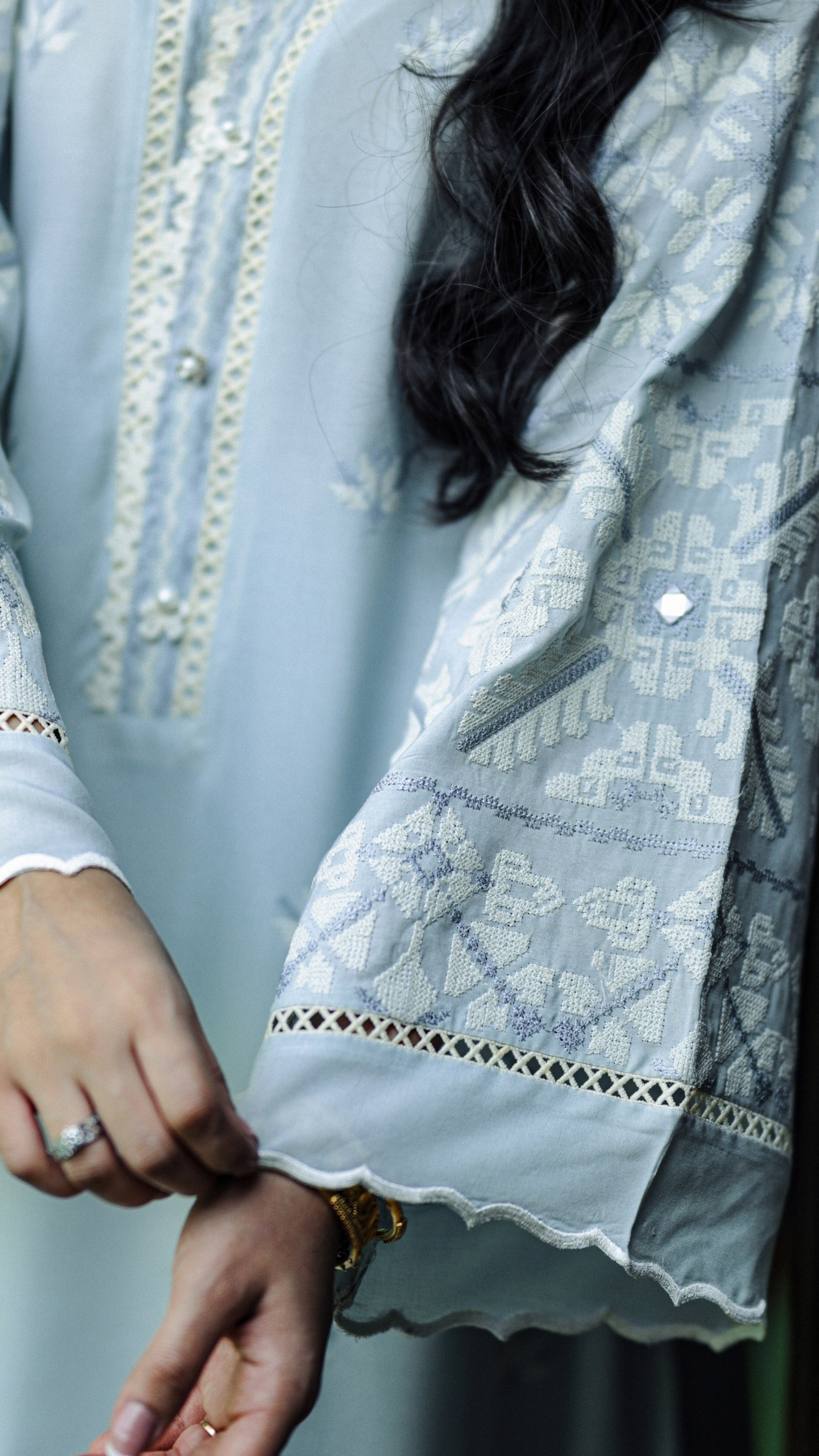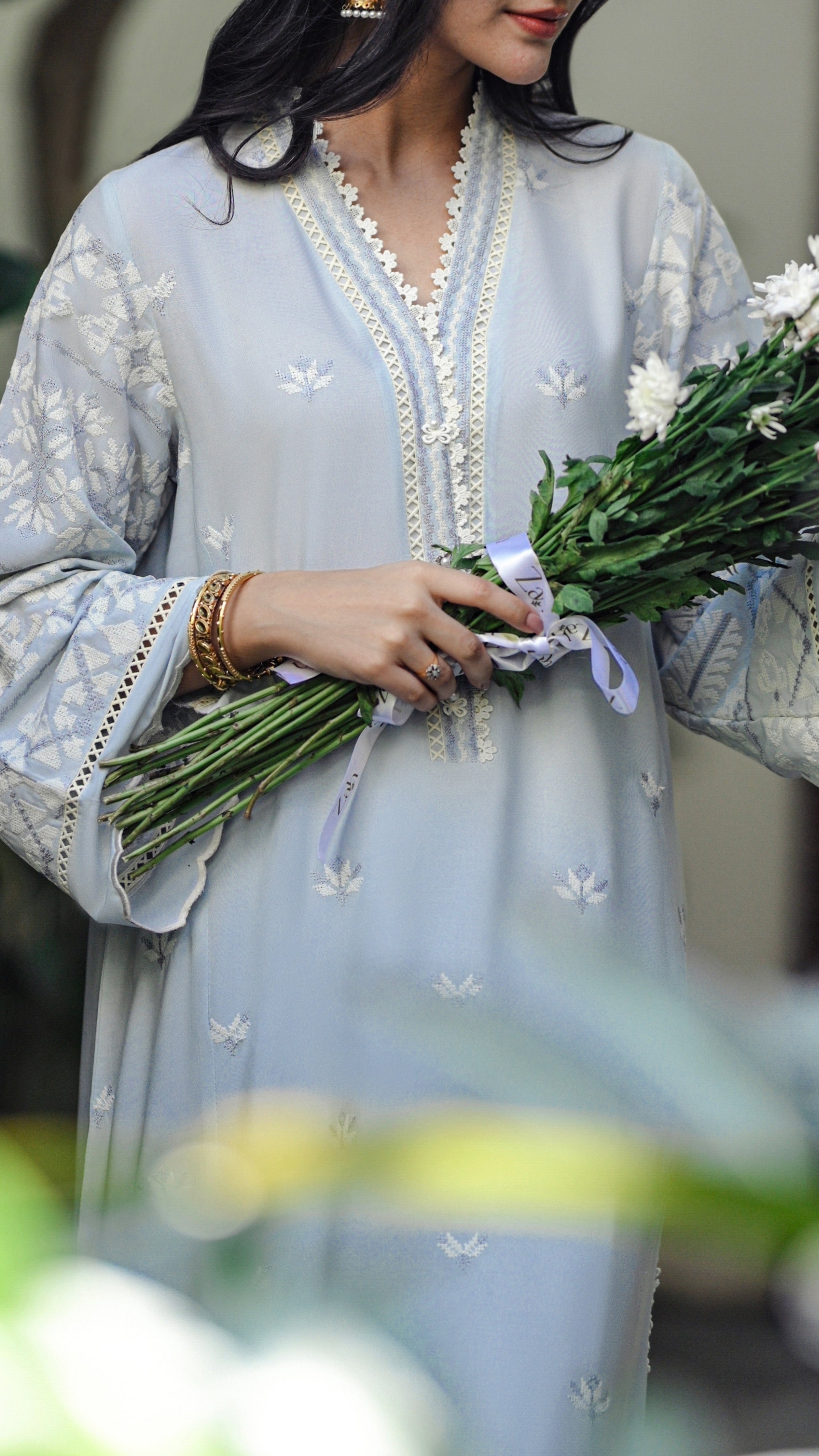 Crafted in a serene powder-blue hue, this flowing silhouette is adorned with delicate ivory embroidery scattered across the canvas. The neckline is finished with intricate lace detailing and subtle button accents, while the statement sleeves feature patterned embroidery and scalloped cuffs for a refined finish. Thoughtfully placed embroidered borders along the hem add depth and movement, creating an effortless piece designed for graceful Ramadan wear, from quiet suhoor mornings to elegant iftar evenings.