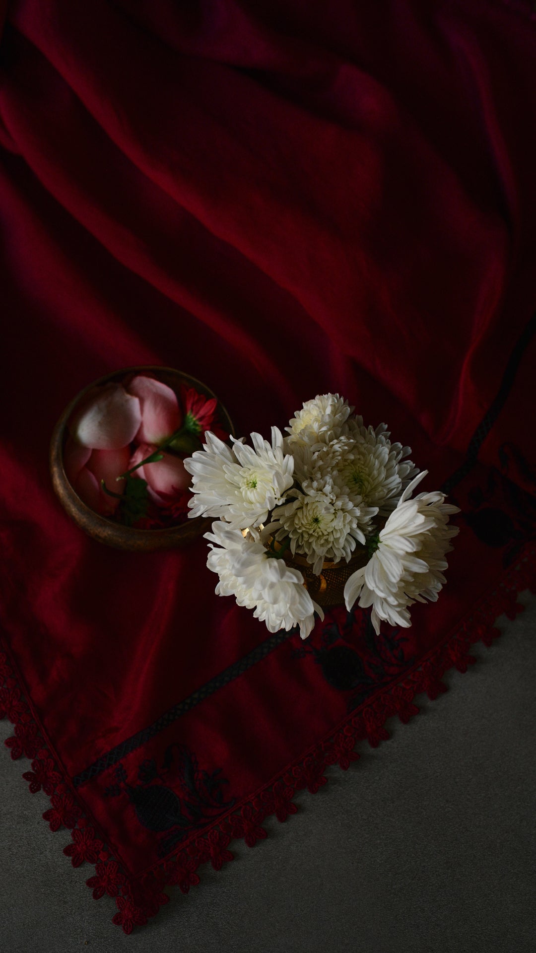 A deep crimson kurta adorned with embroidered pomegranate motifs and subtle mirror accents, finished with a scalloped embroidered neckline detail. The sleeves feature refined embroidery, paired with coordinated embroidered trousers and a fluid, tonal dupatta edged with delicate finishing. A rich yet understated ensemble designed for elegant festive dressing.