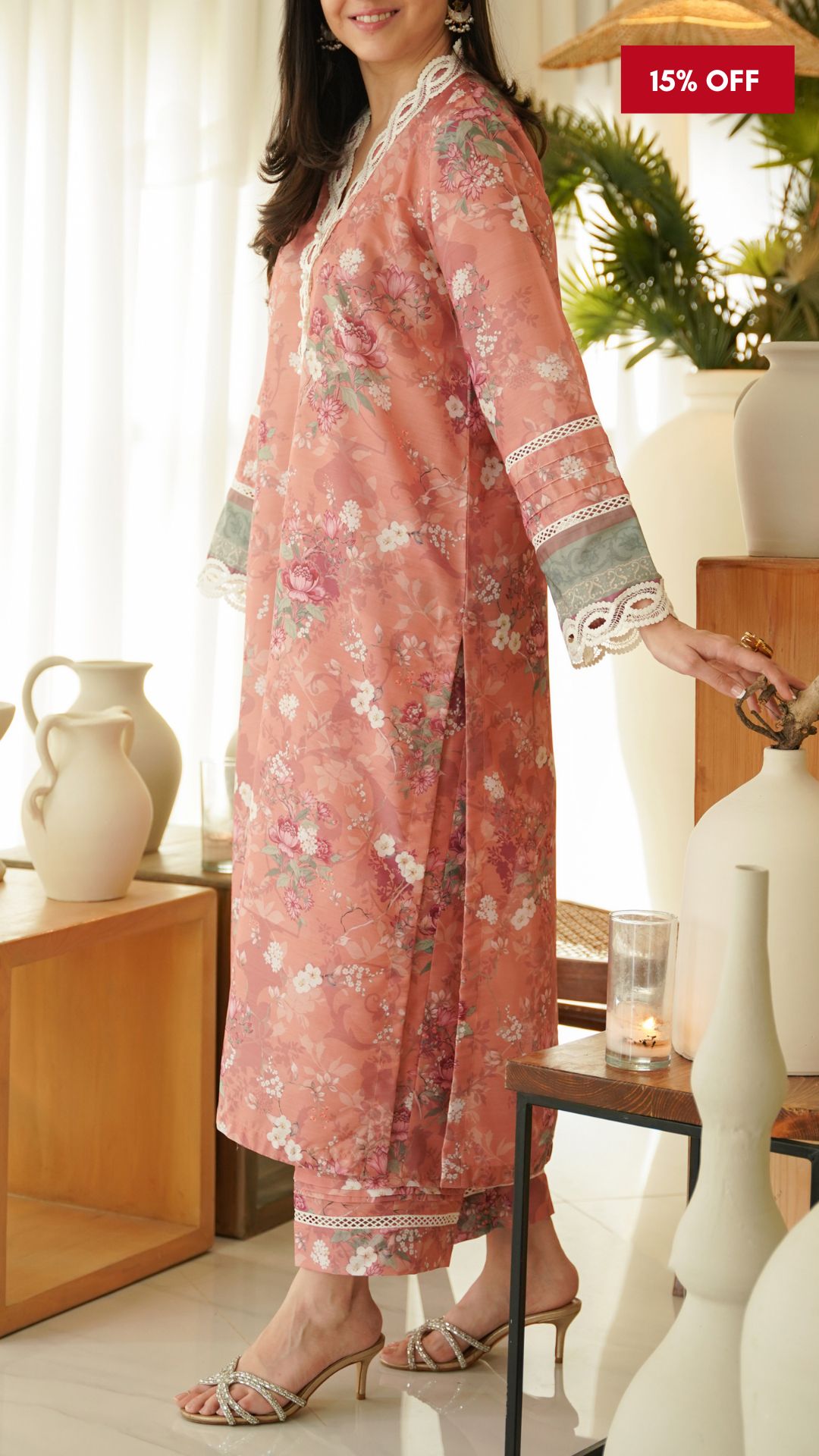 This versatile peach ensemble showcases a delicate self-print floral design, enriched with finely detailed lace accents along the neckline and sleeves. The carefully placed pleats on the sleeves and hem provide a refined structure, enhancing the silhouette.