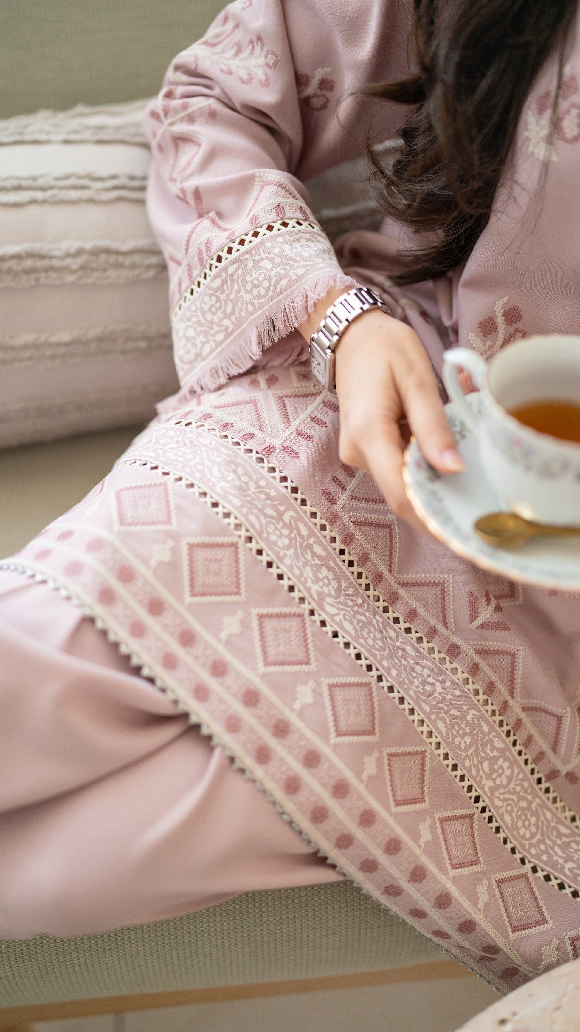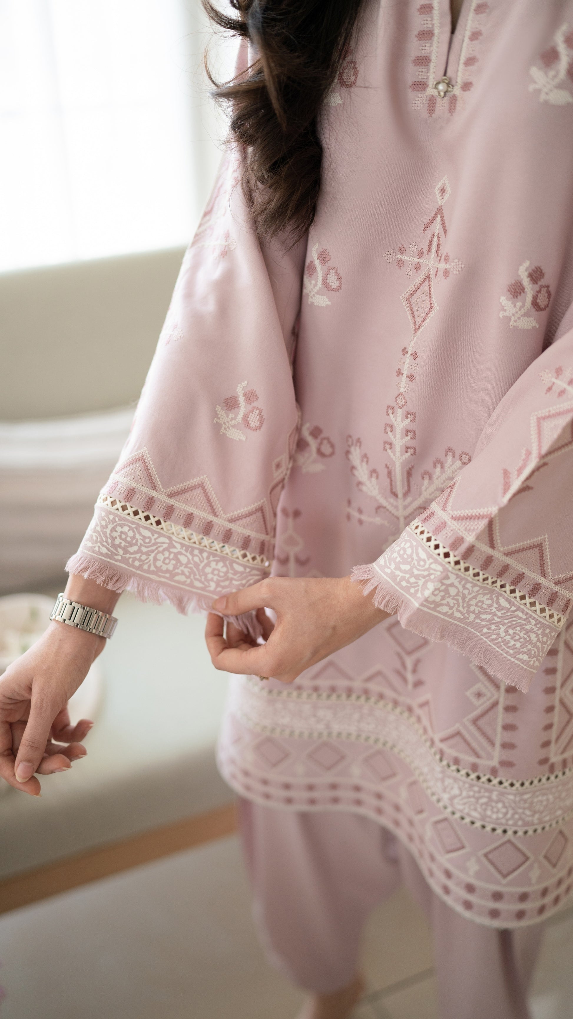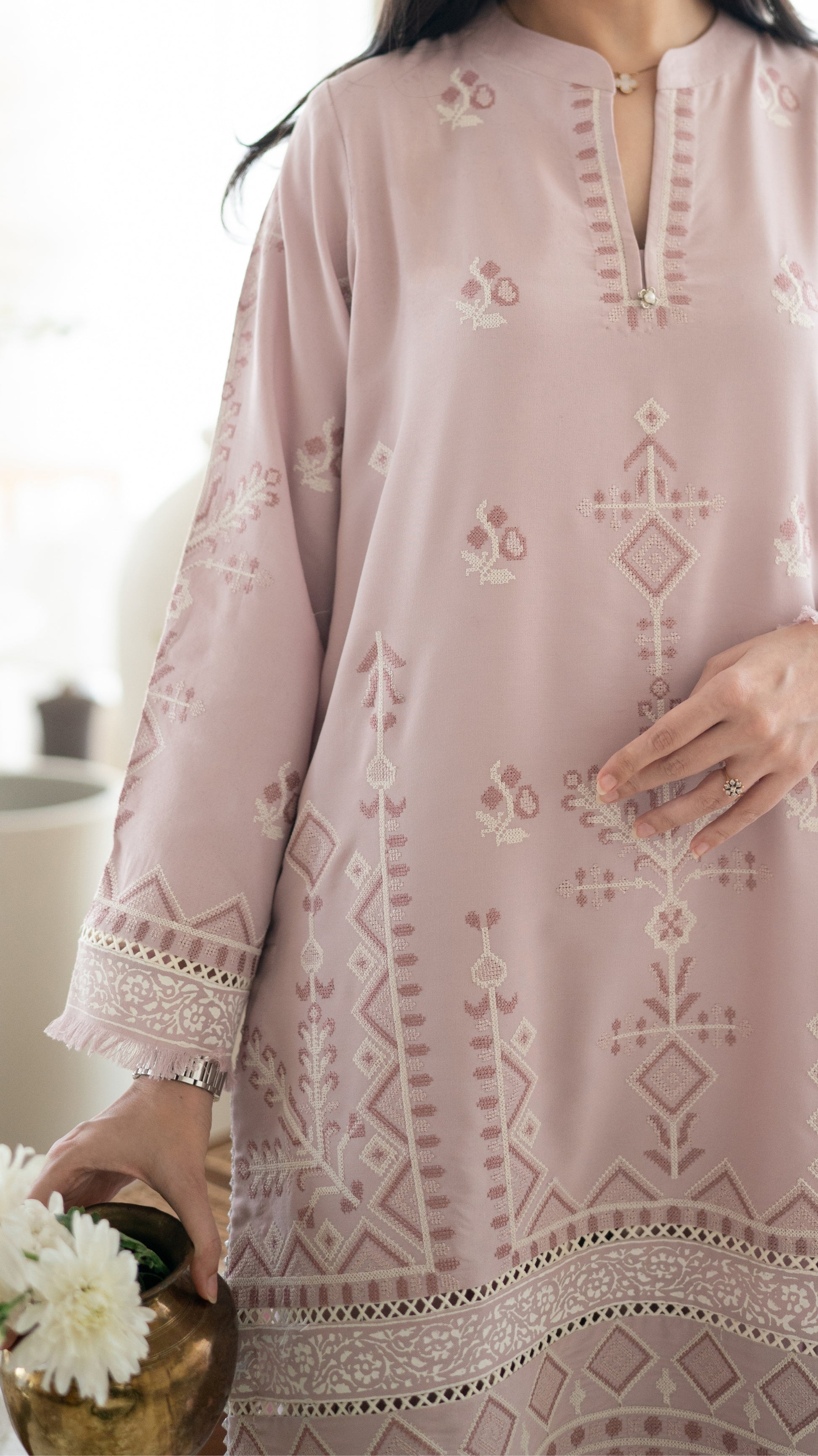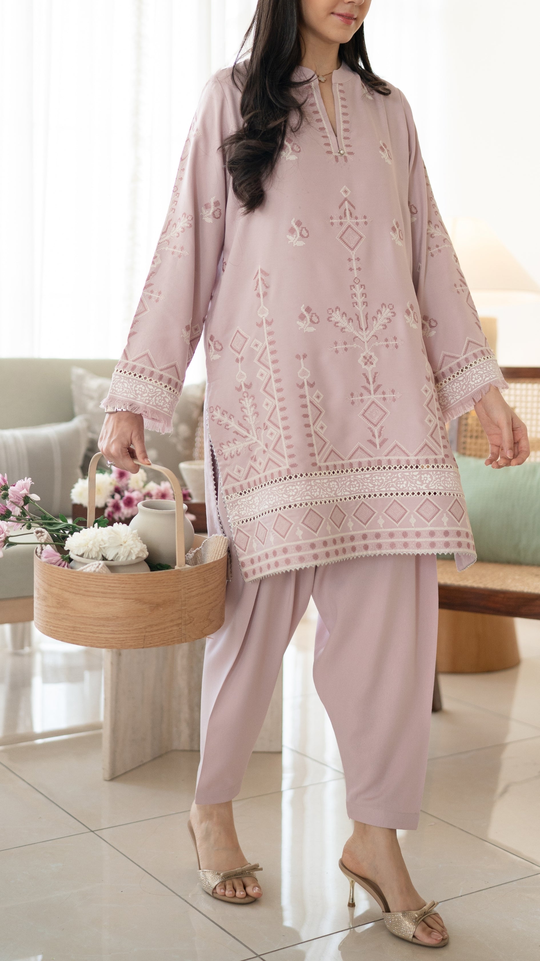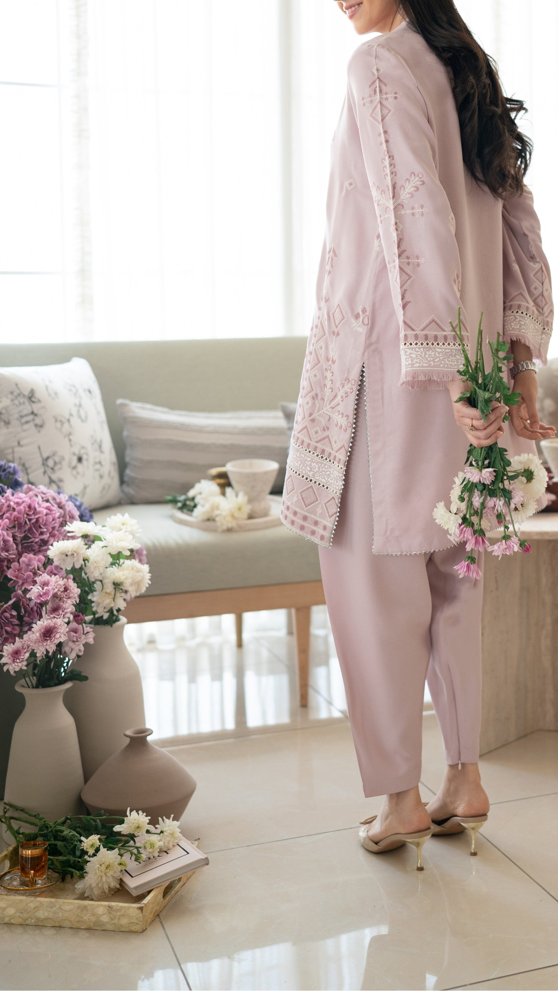 A soft blush lilac kurta crafted in a breathable, flowy fabric, detailed with delicate all-over embroidery inspired by traditional motifs. The neckline is finished with a subtle embroidered placket, while the sleeves and hem are accented with intricate lace trims that add depth and refinement. Paired with our signature skinny shalwar, this ensemble offers an effortless balance of comfort and elegance, perfect for daytime gatherings and understated festive wear.