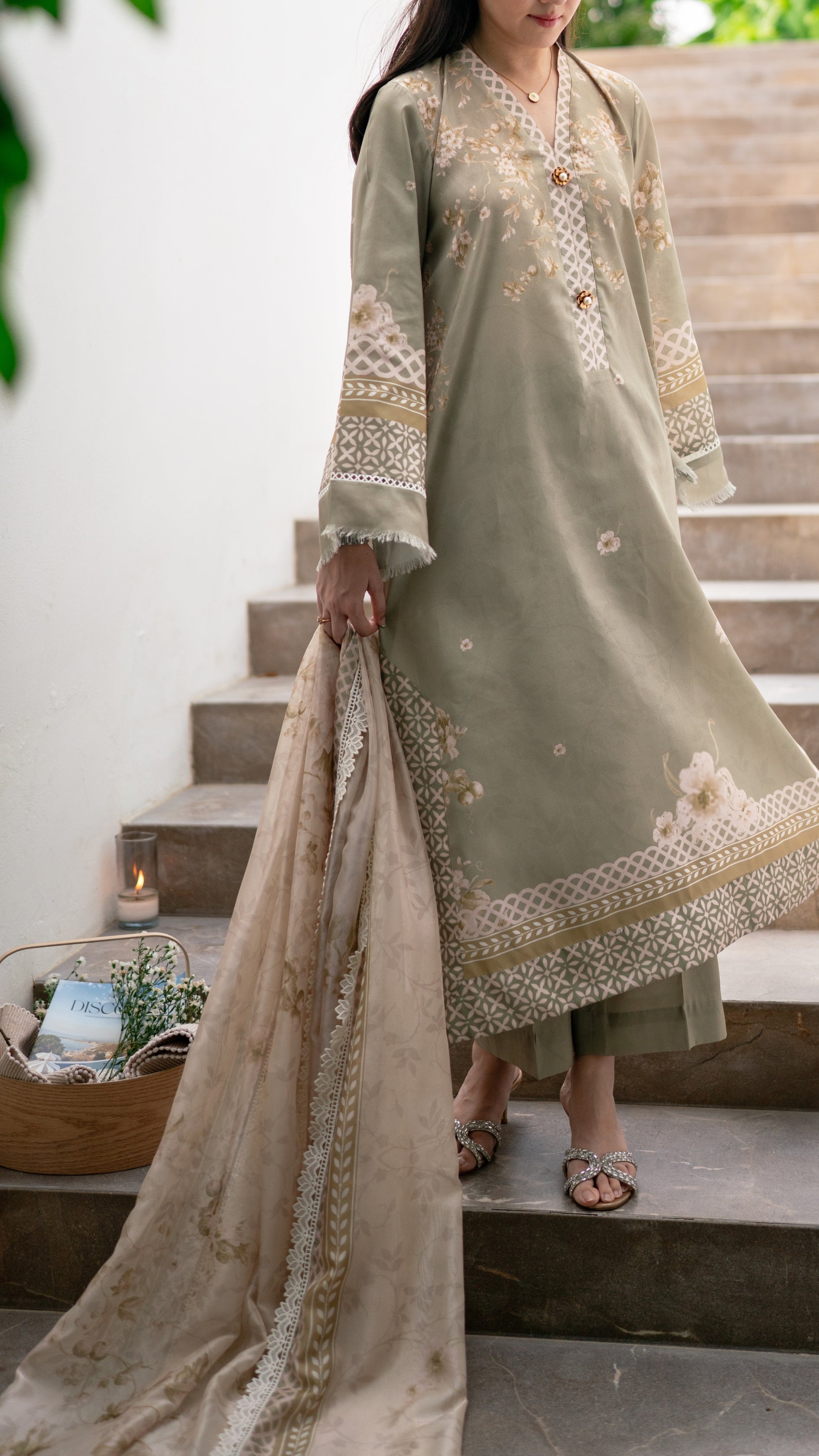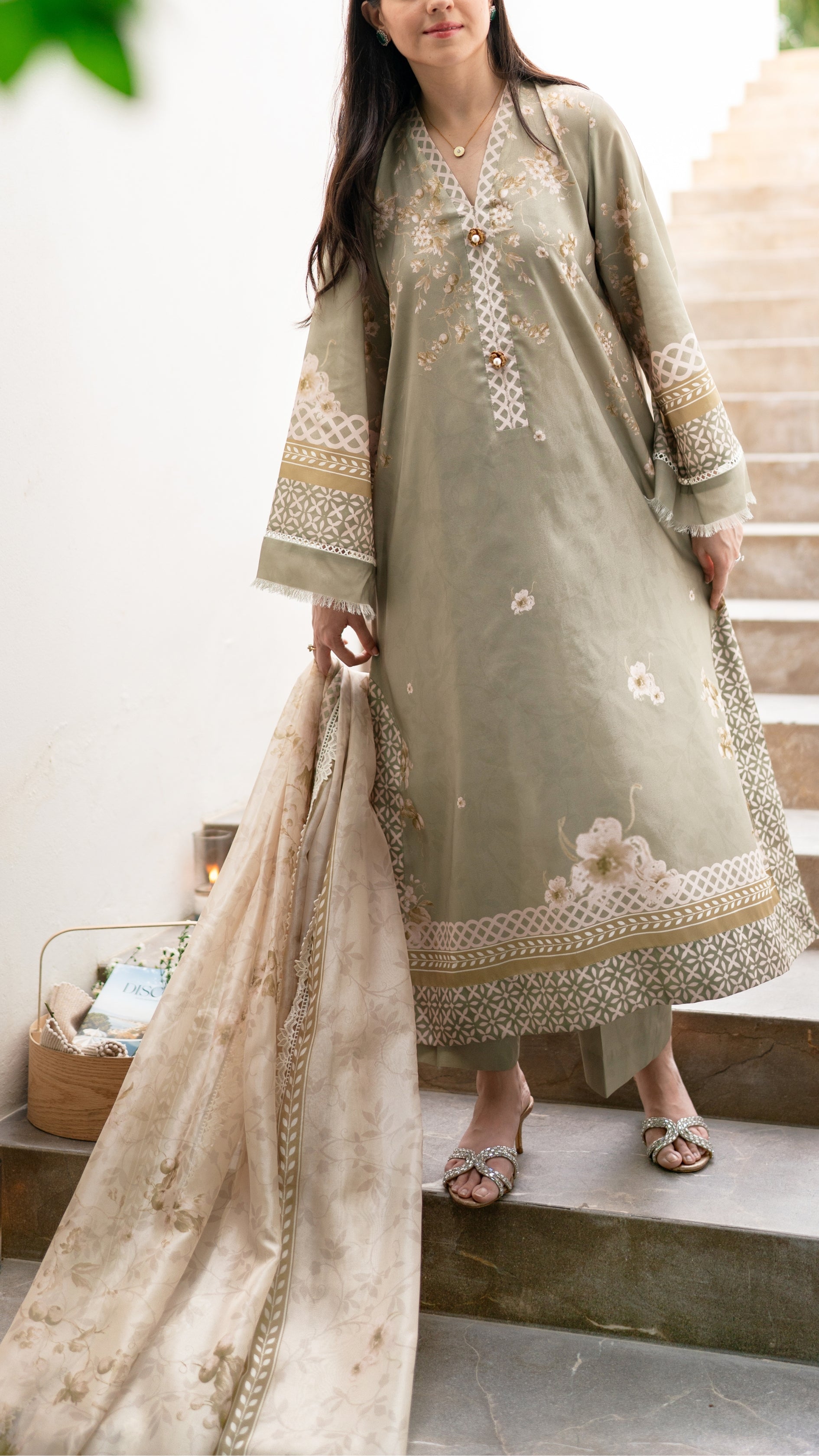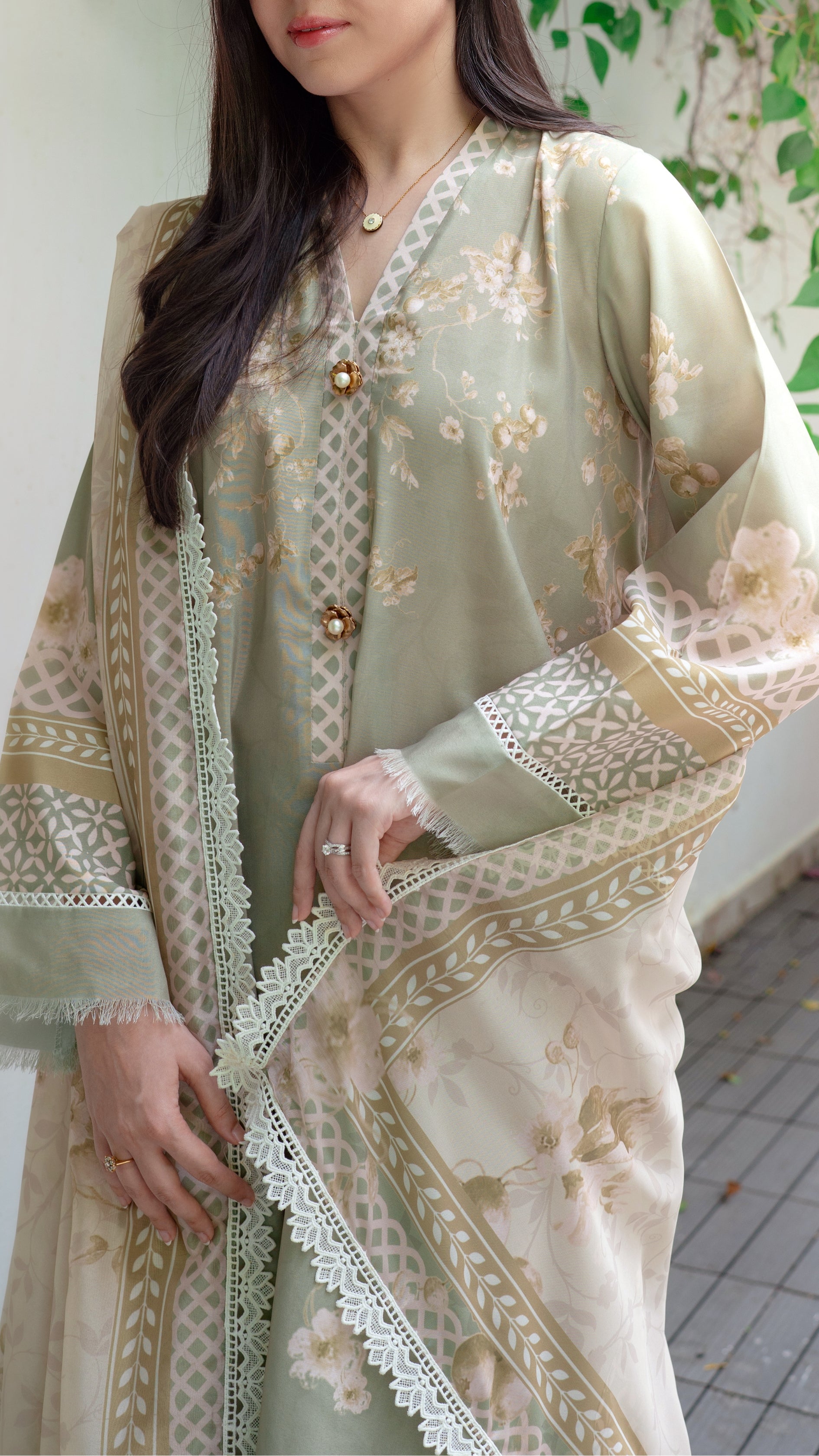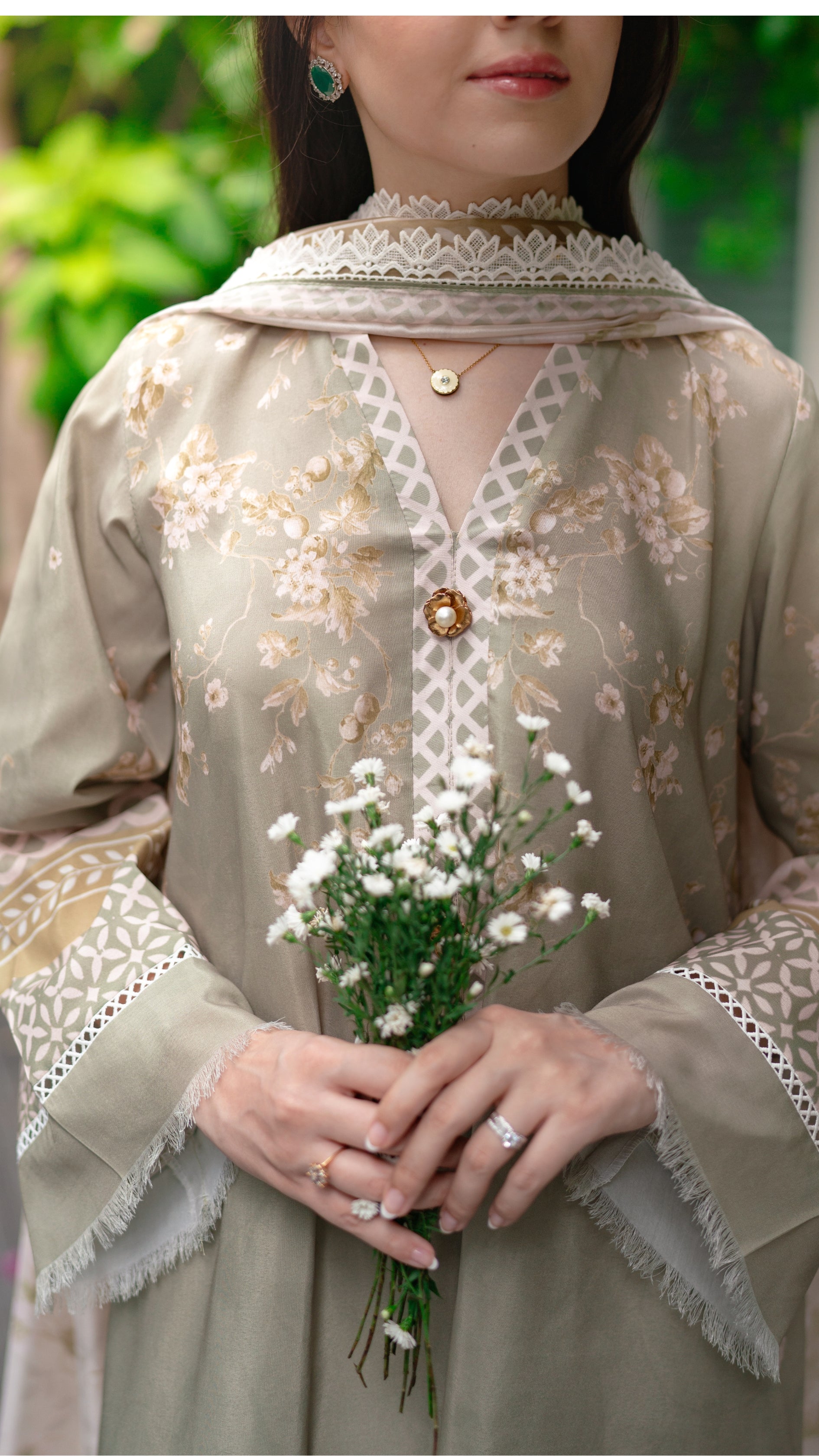 A serene sage green ensemble that captures the calm and poise of autumn days. Delicately adorned with soft floral embroidery and intricate lacework along the sleeves and hem, it’s paired with a matching izaar and a printed dupatta that adds an airy elegance. Graceful, understated, and timeless — this look evokes the quiet charm of falling leaves and golden light.