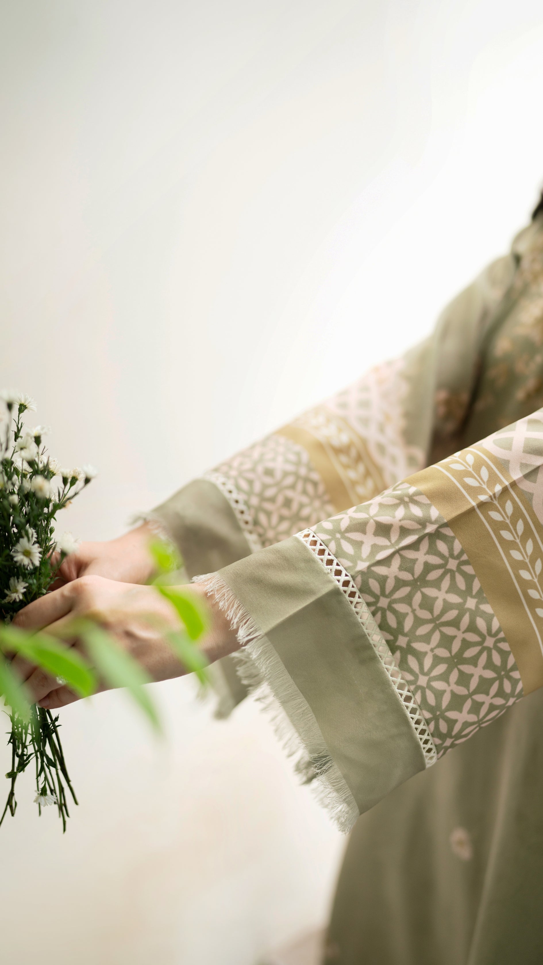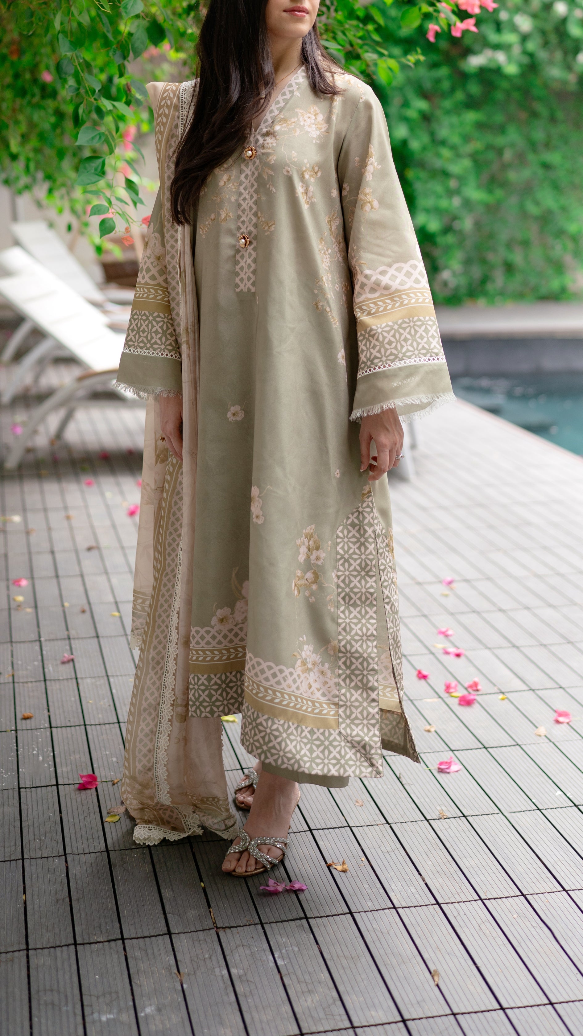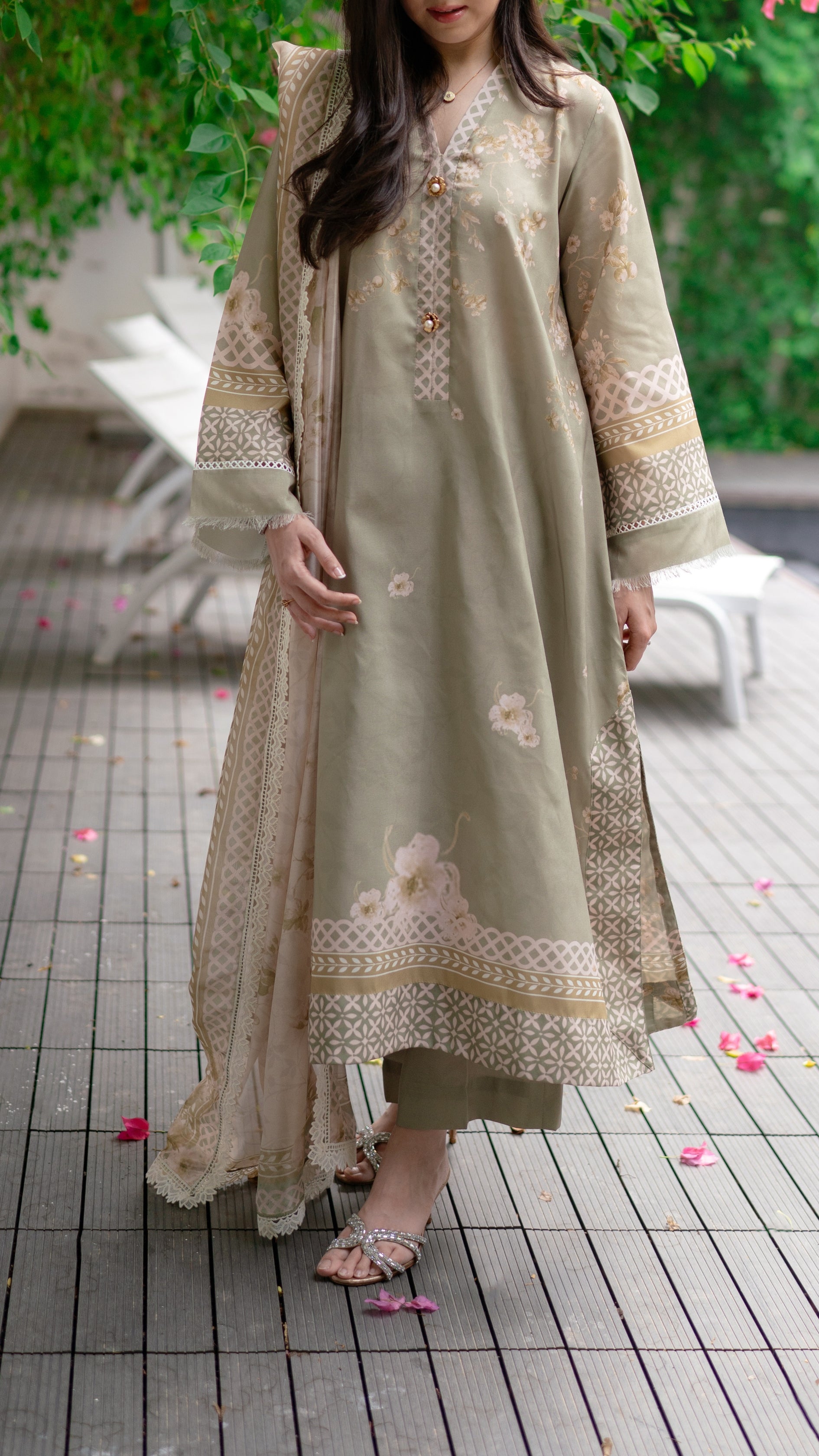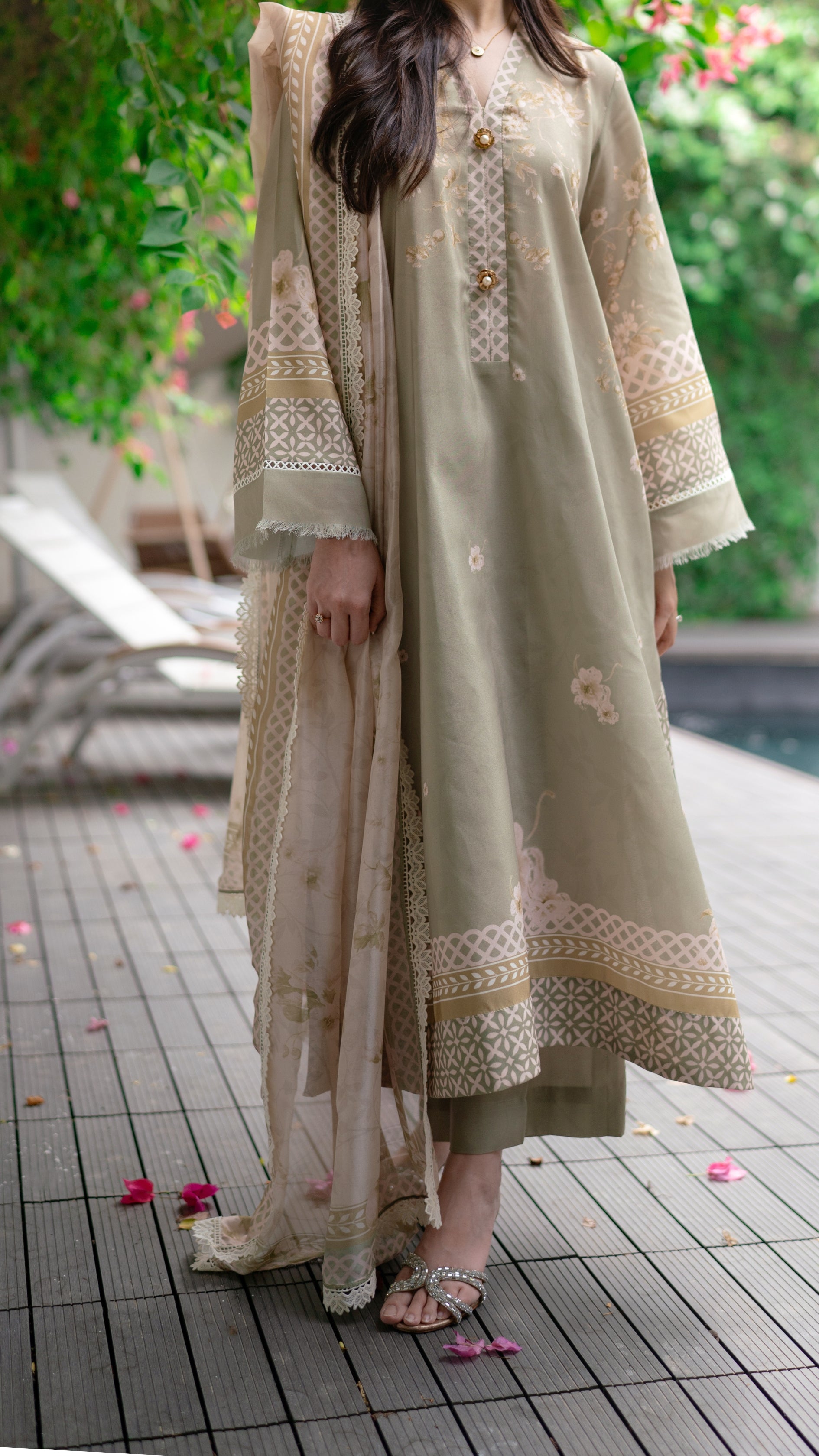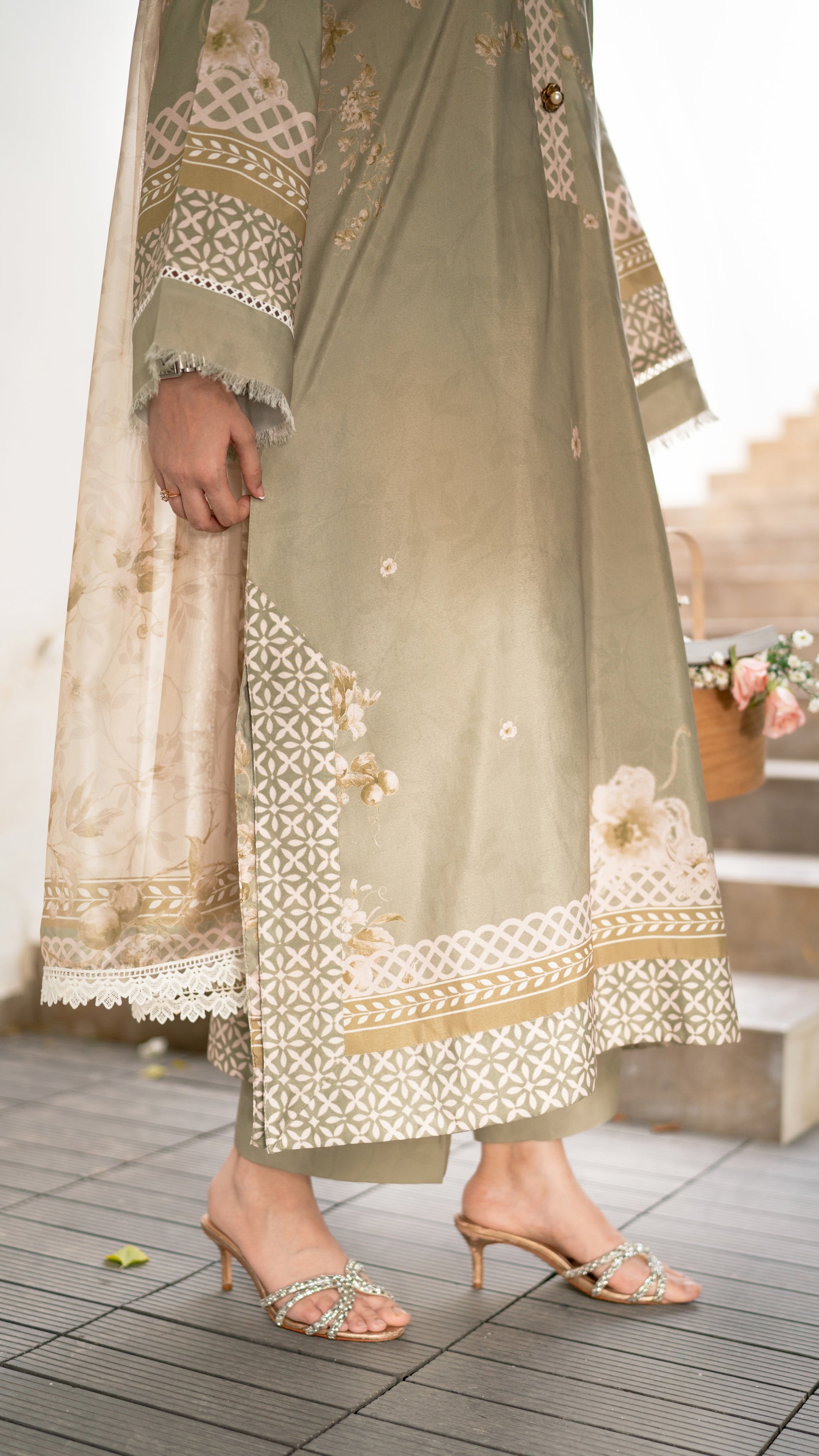 A serene sage green ensemble that captures the calm and poise of autumn days. Delicately adorned with soft floral embroidery and intricate lacework along the sleeves and hem, it’s paired with a matching izaar and a printed dupatta that adds an airy elegance. Graceful, understated, and timeless — this look evokes the quiet charm of falling leaves and golden light.