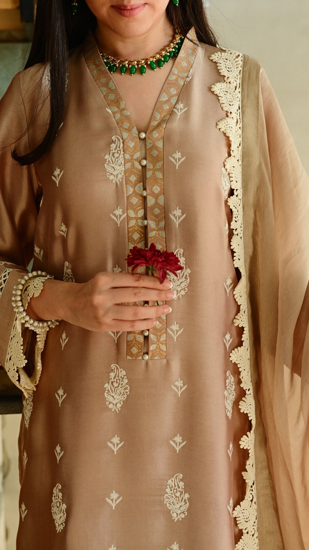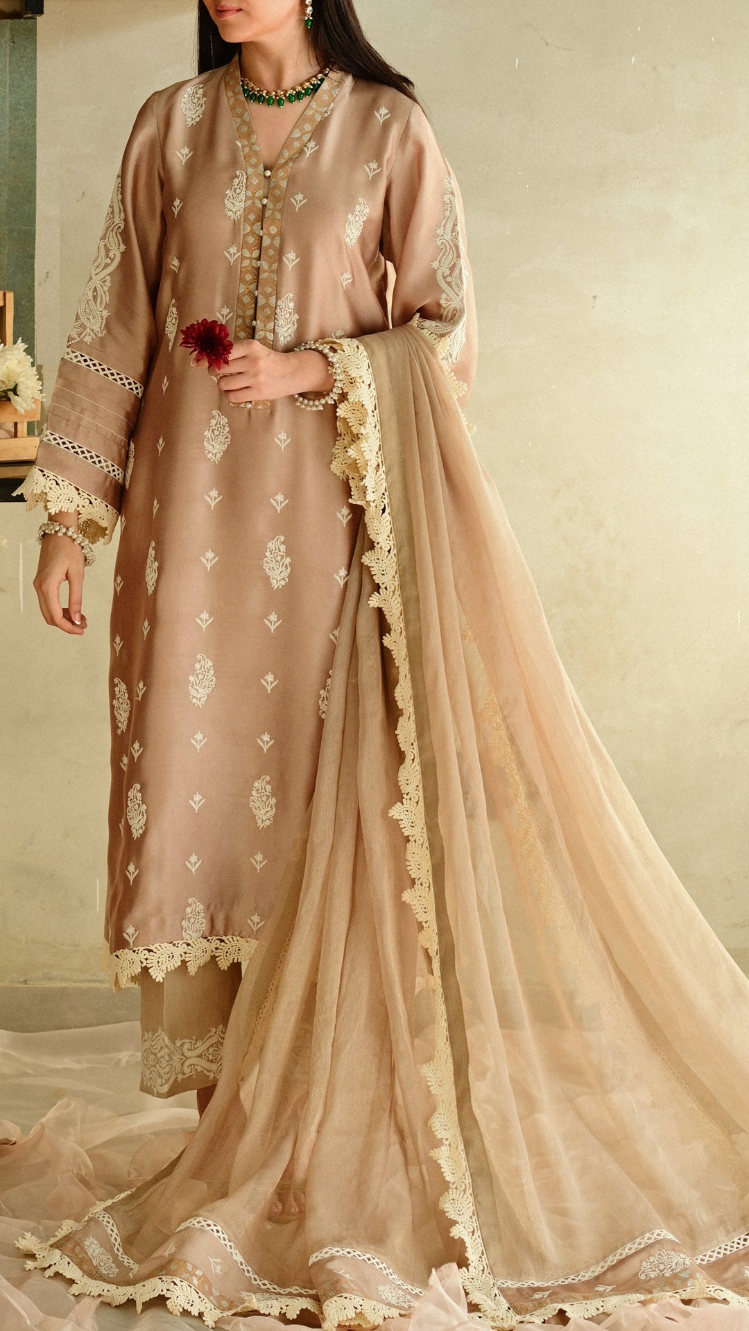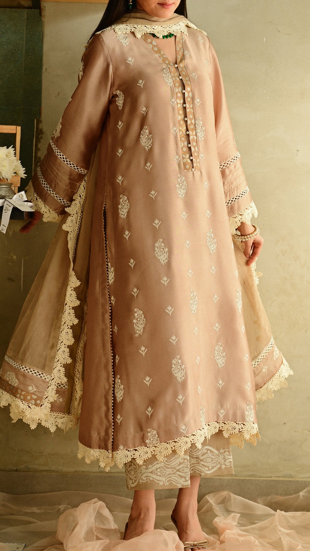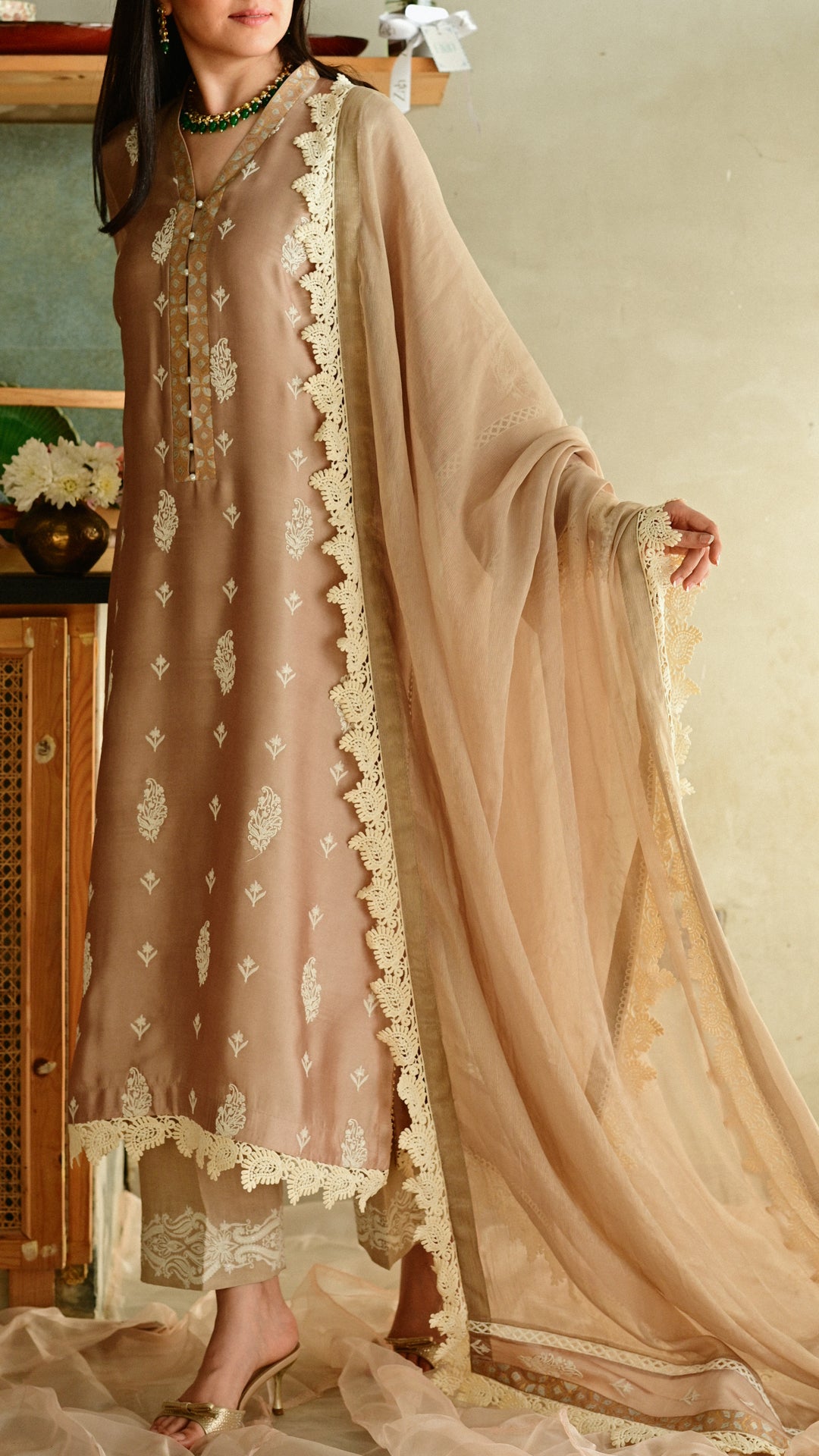 A softly structured kurta rendered in a warm neutral hue, adorned with delicate all-over paisley motifs and complemented by intricate block-print detailing along the neckline. Finished with fine lace accents on the hem and sleeves, and paired with embroidered trousers and a delicately edged dupatta, this ensemble balances understated elegance with festive refinement, ideal for intimate Eid gatherings and daytime celebrations.