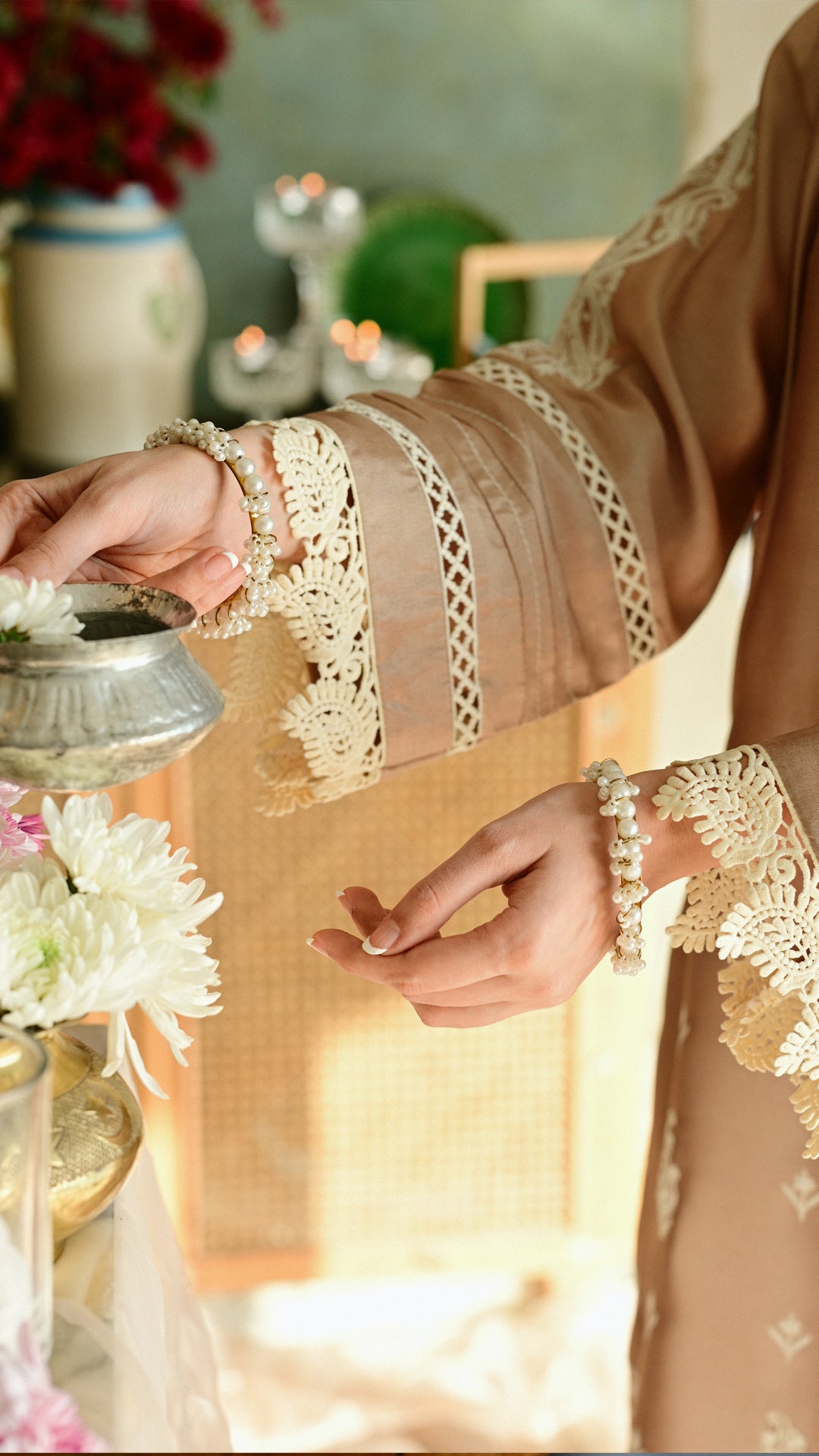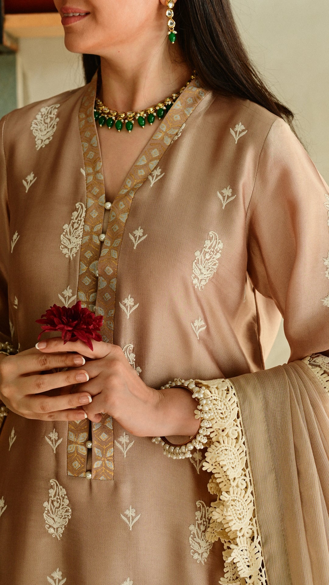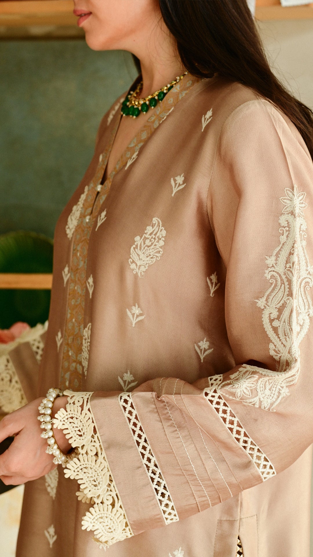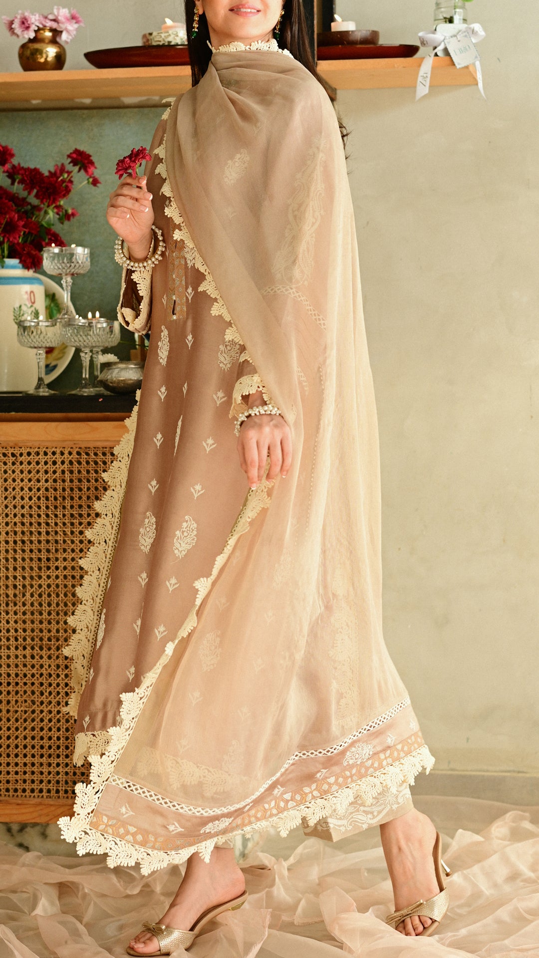 A softly structured kurta rendered in a warm neutral hue, adorned with delicate all-over paisley motifs and complemented by intricate block-print detailing along the neckline. Finished with fine lace accents on the hem and sleeves, and paired with embroidered trousers and a delicately edged dupatta, this ensemble balances understated elegance with festive refinement, ideal for intimate Eid gatherings and daytime celebrations.