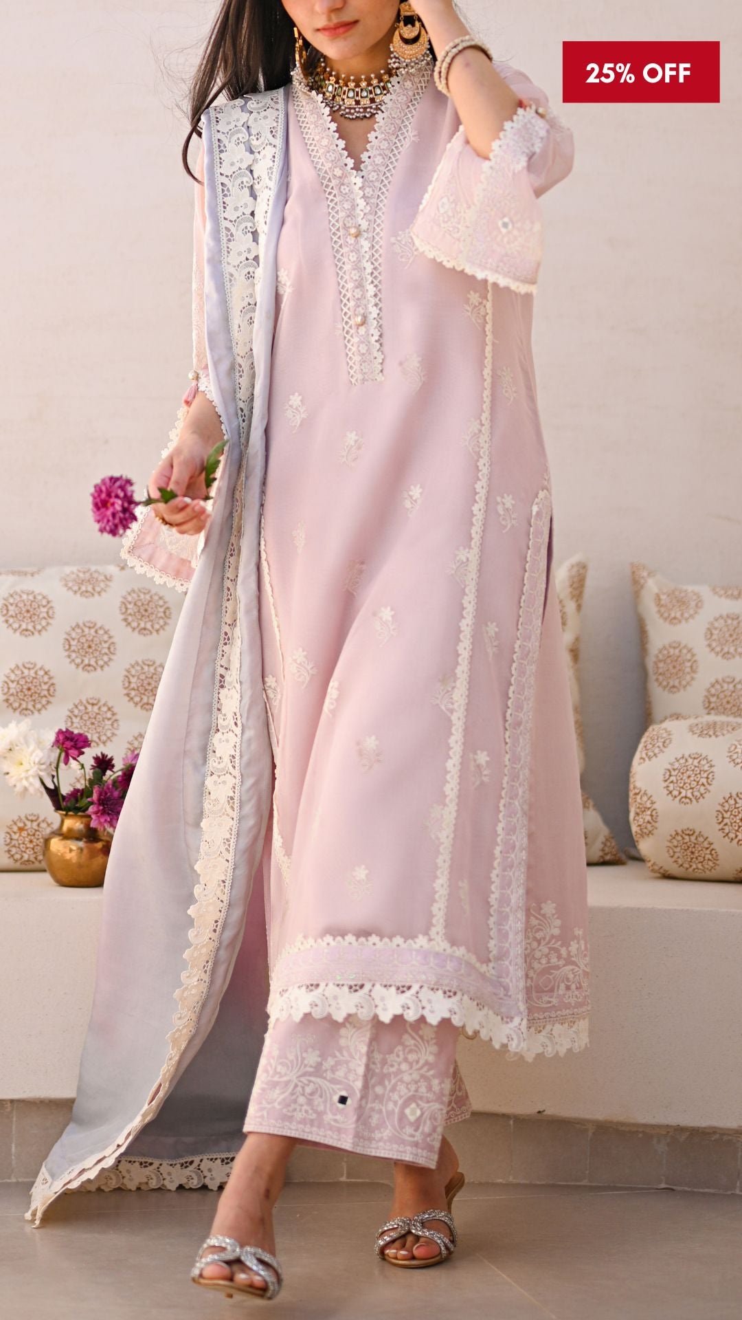 Paired with a multi-colored pastel hue tie-and-dye silk dupatta, embellished with classic floral finishing. Crafted from Pure silk, the dupatta offers a graceful drape, a soft sheen, and lightweight luxury. A timeless investment in effortless sophistication, this look blends artisanal detailing with modern refinement for the joyous Eid days.