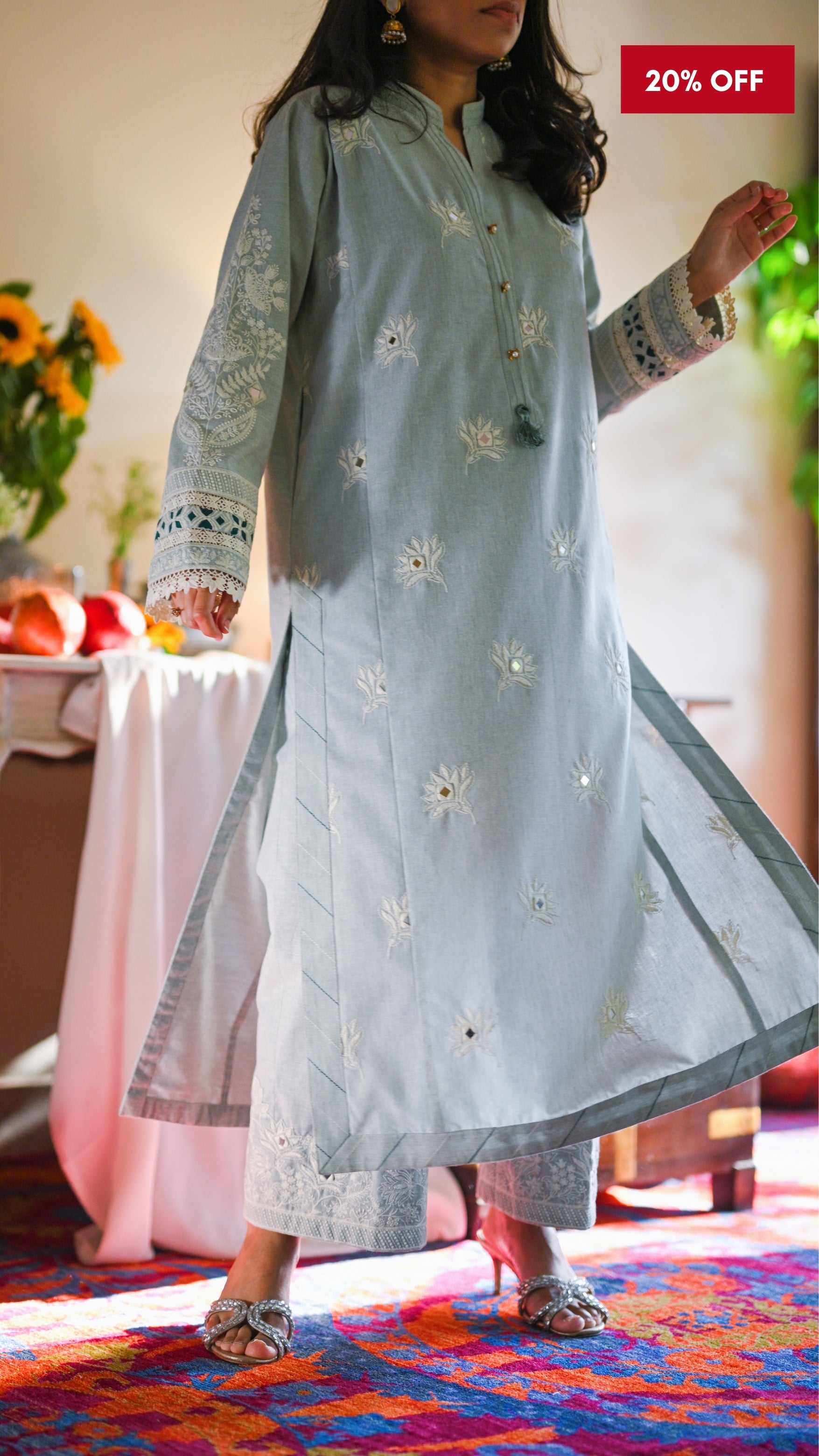 Rendered in the perfect pistachio green, this elegant kurta is adorned with intricate mirror work and our forever-favorite pockets. Statement block-printed sleeves, featuring geometric patterns, seamlessly flow into hand-curated stitches on the daman. Threadworked tonal stitches on the hemline add to the finesse, elevating the design with intricate craftsmanship. Paired with a delicately embroidered izaar in matching accents, this piece exudes understated elegance and timeless appeal.