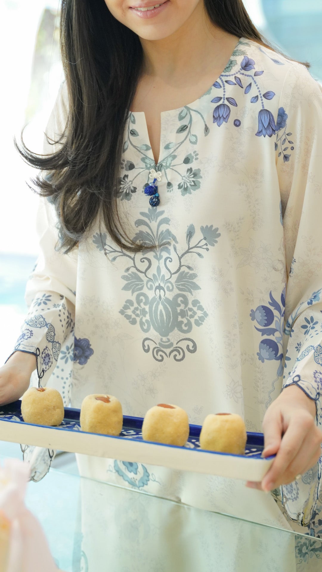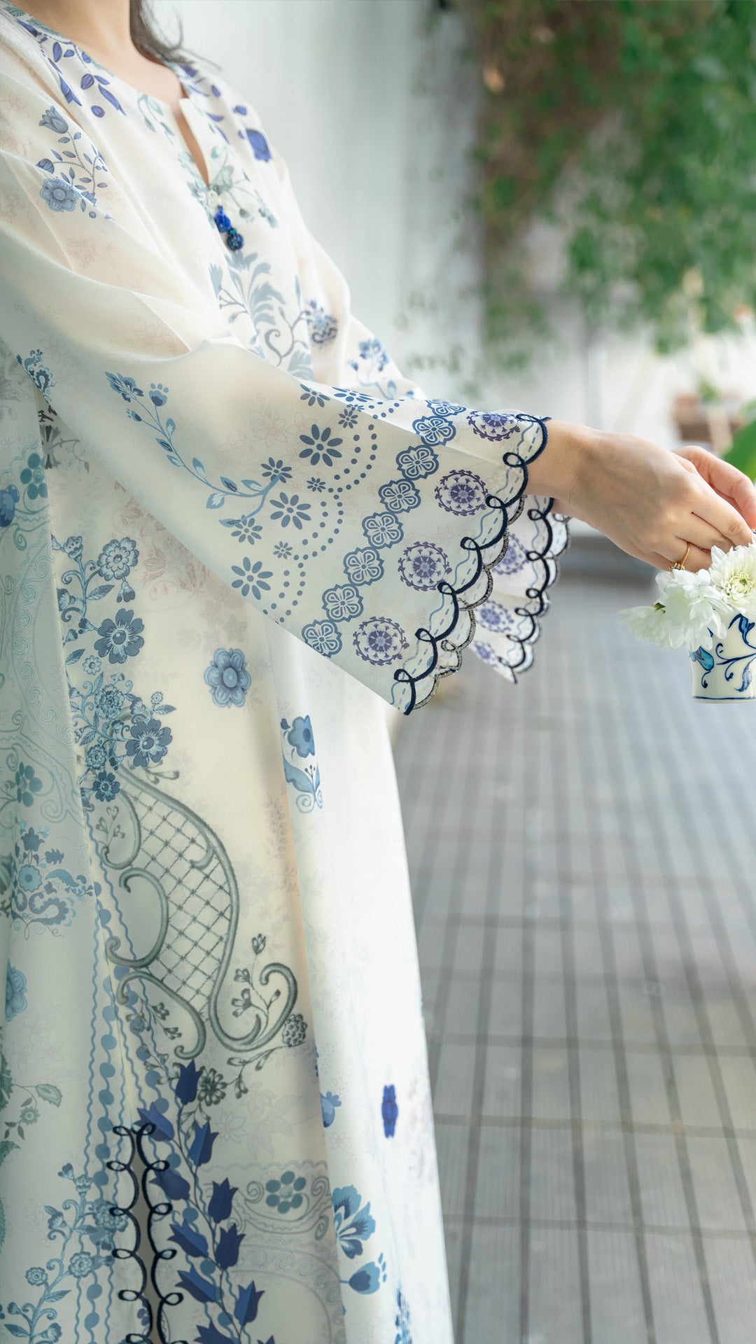 Rendered in a soft ivory base with intricate powder blue and deep slate-blue florals, this flowing silhouette captures understated elegance. The airy, relaxed cut drapes effortlessly, while scalloped border detailing in tonal blue adds refined definition.